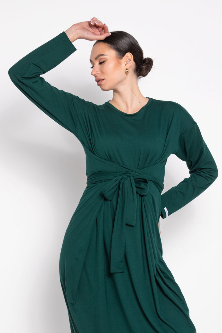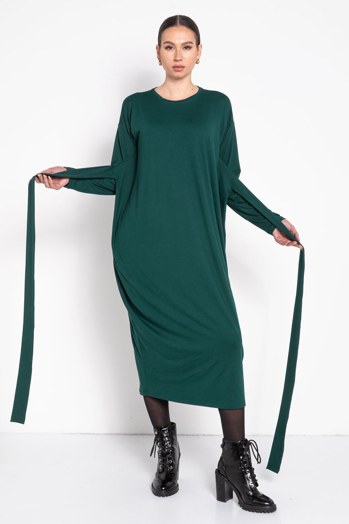 Vádliközép hosszúságú, hosszú ujjú, laza fazonú ruha. Zárt és kerek nyakkivágása keskeny pánttal szegett. Oldalába rögzített hosszú kötőjével a derékon többször átfűzhető. Ujján SUGARBIRD feliratú címkével díszítettük.