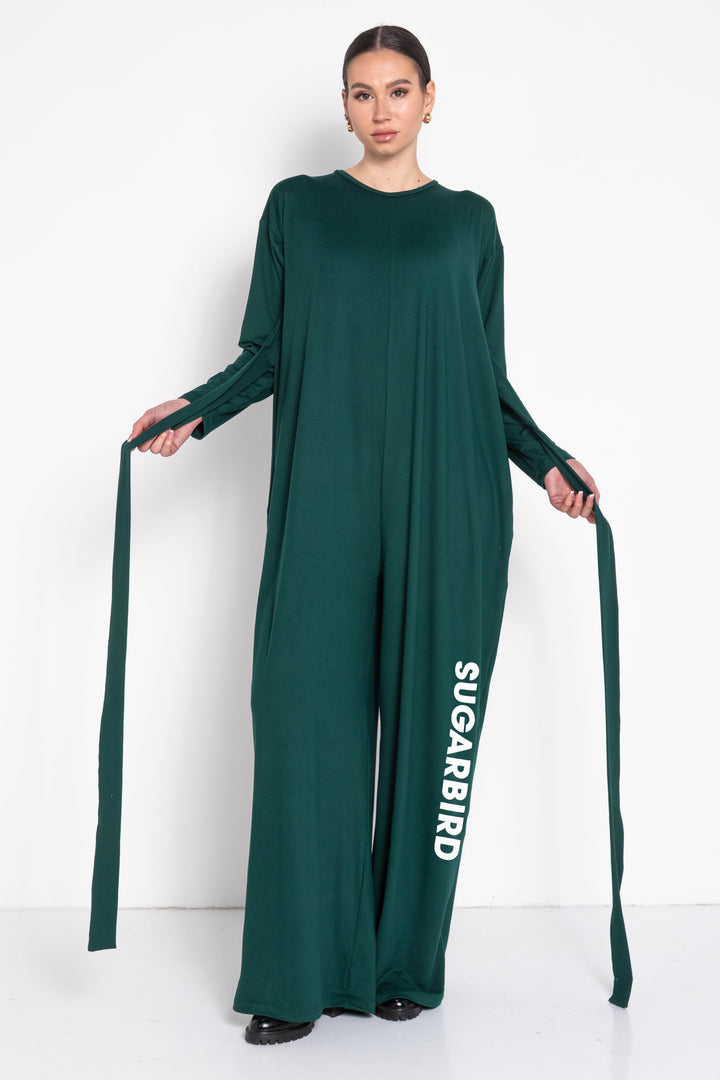 Hosszú és bő szárú, hosszú ujjú, lazafazonú overál. Zárt nyakkivágása keskeny pánttal szegett a hátán egy hasíték felett gombbal záródik. Oldalába rögzített hosszú kötőjével a derékon többször átfűzhető. Ujján SUGARBIRD feliratú címkével díszítettük.