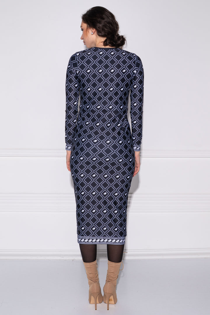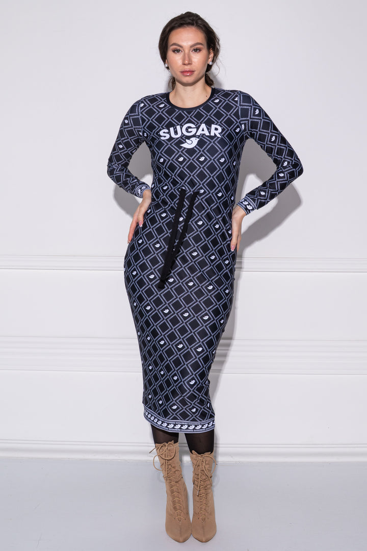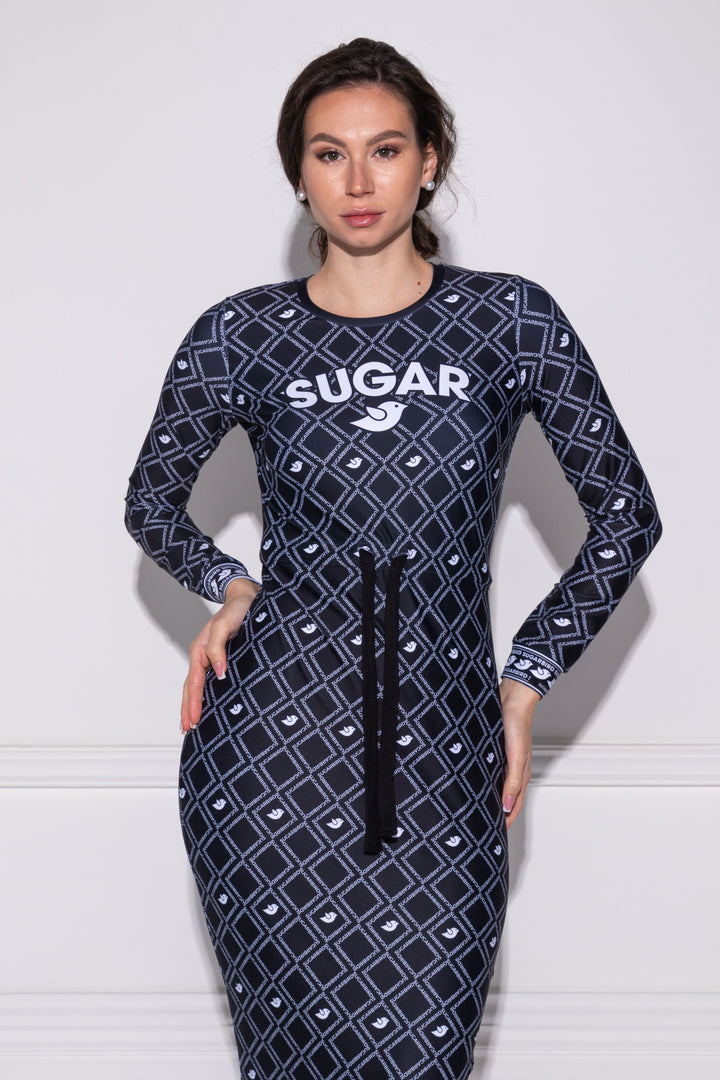 Hosszú ujjú, vádli közép hosszúságú, alak követő ruha. Zárt kerek nyaka, alja és ujja alja félbe hajtott pántokkal szegettek. Dereka egy széles kötő által szűkíthető. A fazonra SUGARBIRD feliratú címkét varrtunk.