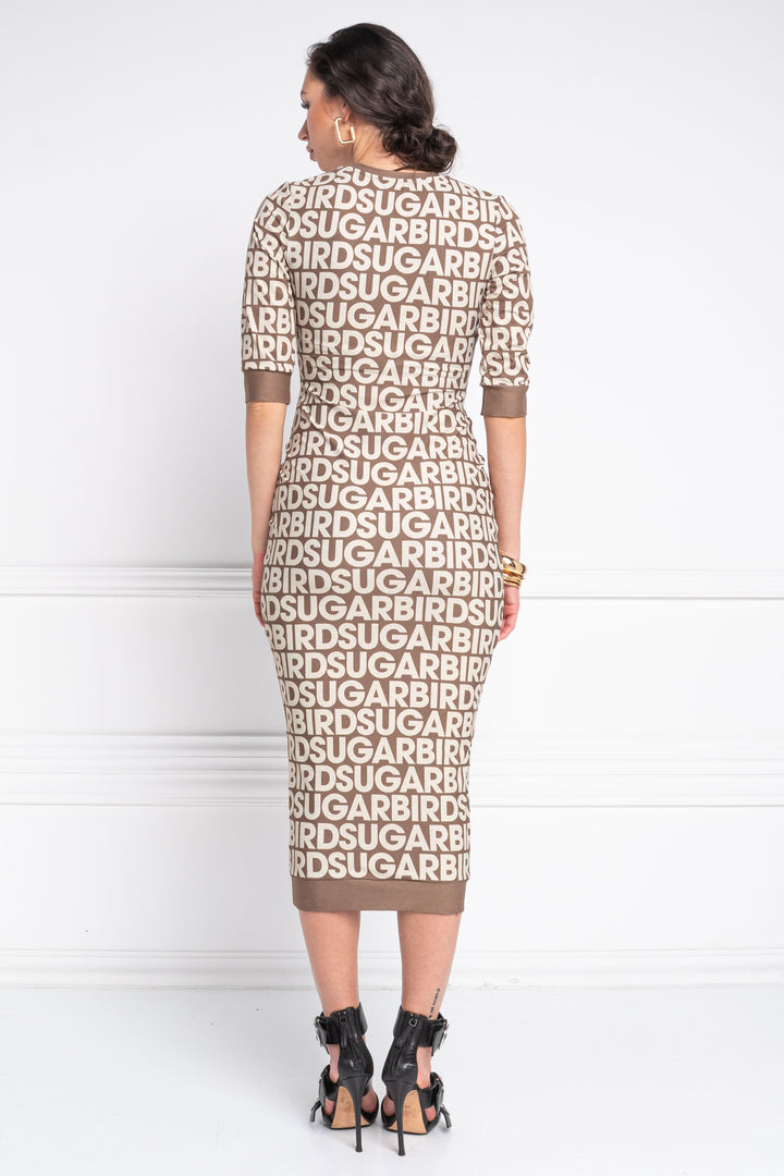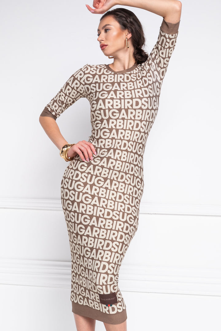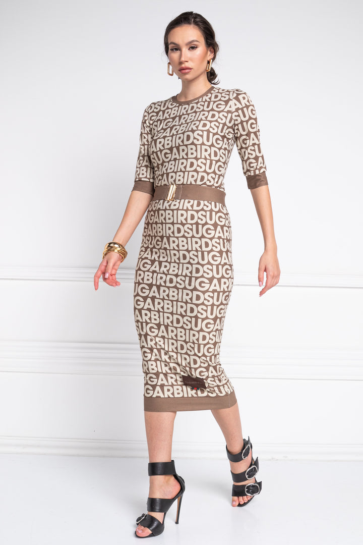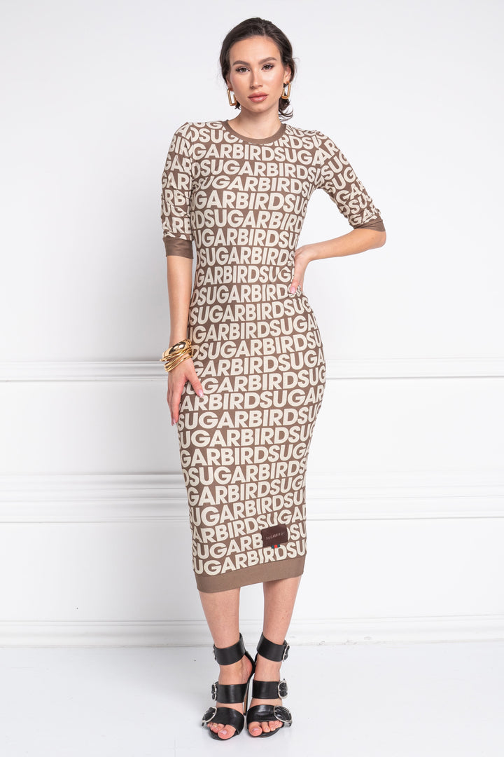 Háromnegyedes ujjú, vádli közép hosszúságú, alak követő ruha. Zárt kerek nyaka, alja és ujja alja félbe hajtott pántokkal szegettek. Elejére szövött szalaggal ellátott SUGARBIRD feliratú címkét varrtunk.