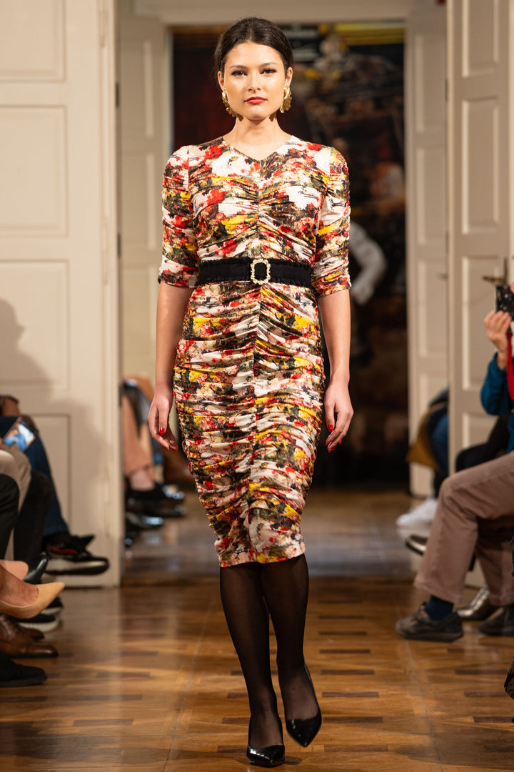Lábszárközép hosszúságú, háromnegyedes ujjú, laza fazonú ruha. Oldalain és eleje, háta, valamint ujja szabásvonalaiban dúsan ráncolt. Kerek nyakkivágását keskeny pánt szegi.