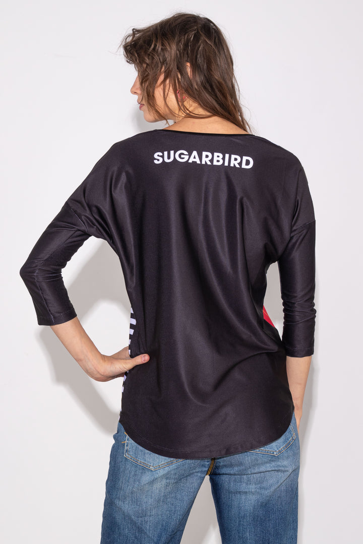 Háromnegyedes ujjú, csípő alá érő, ejtett vállú, laza fazonú felső. Kerek kivágású nyakát keskeny pánt szegi. Oldalán SUGARBIRD feliratú címkével díszítettük.