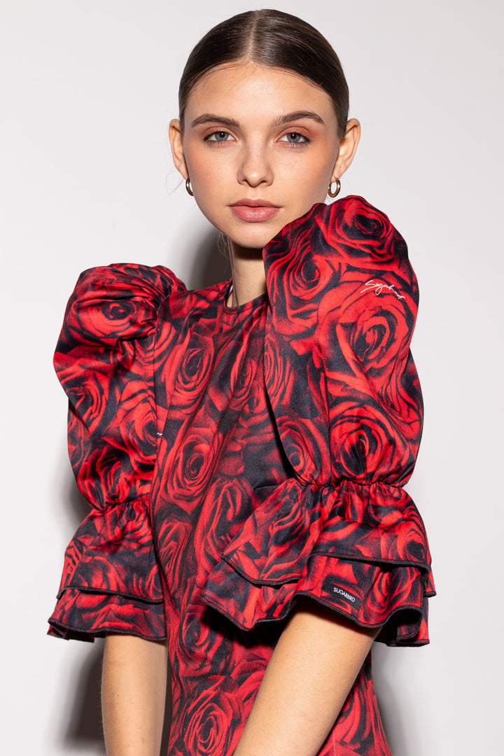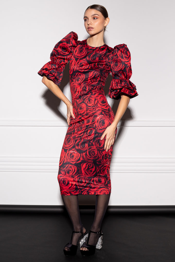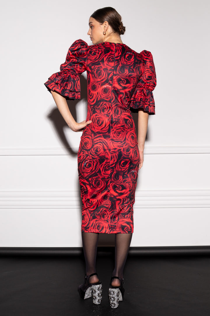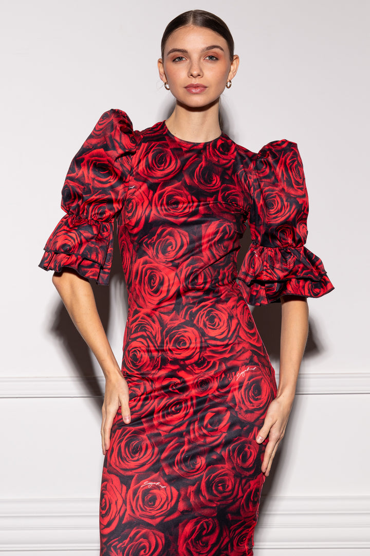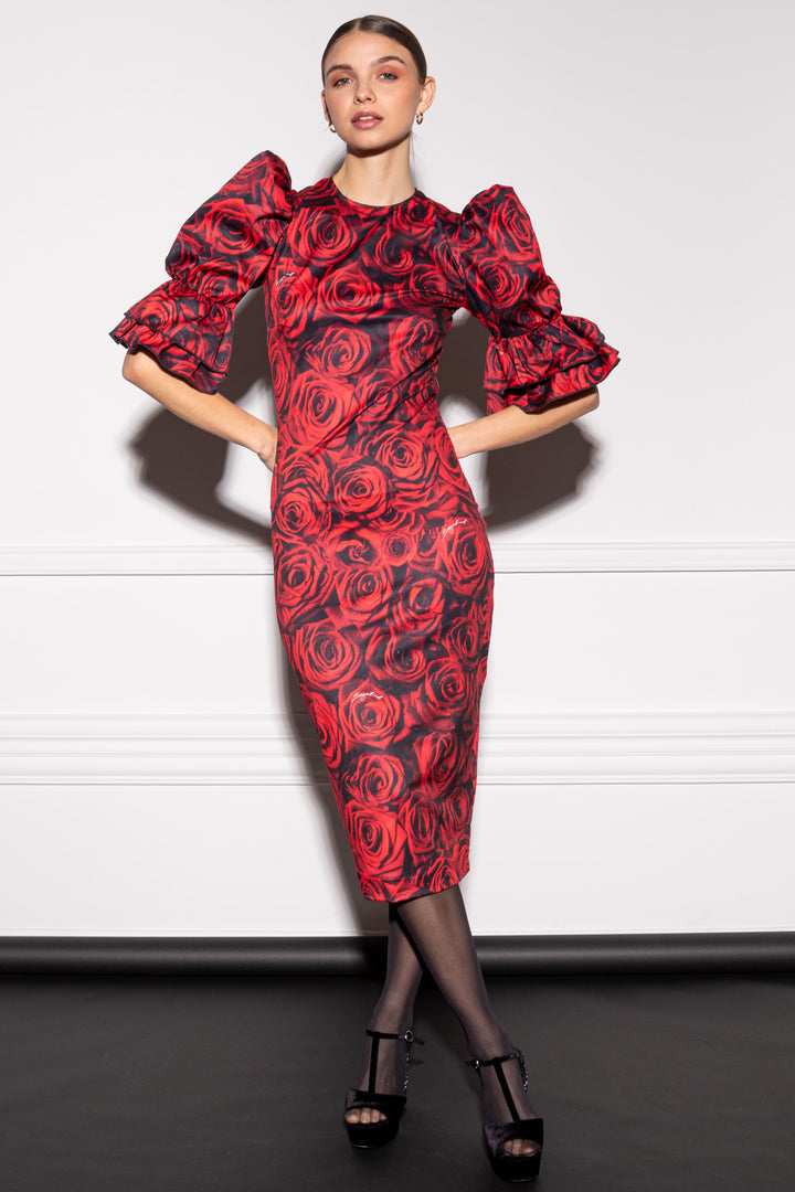 Vádliközép hosszúságú, háromnegyedes és puffos ujjú, alak követő ruha. Háta közepén zipzárral nyitható. Ujjai a vállain húzottak, alját két-két keskeny fodor díszíti. Ujjára SUGARBIRD feliratú címkét varrtunk.