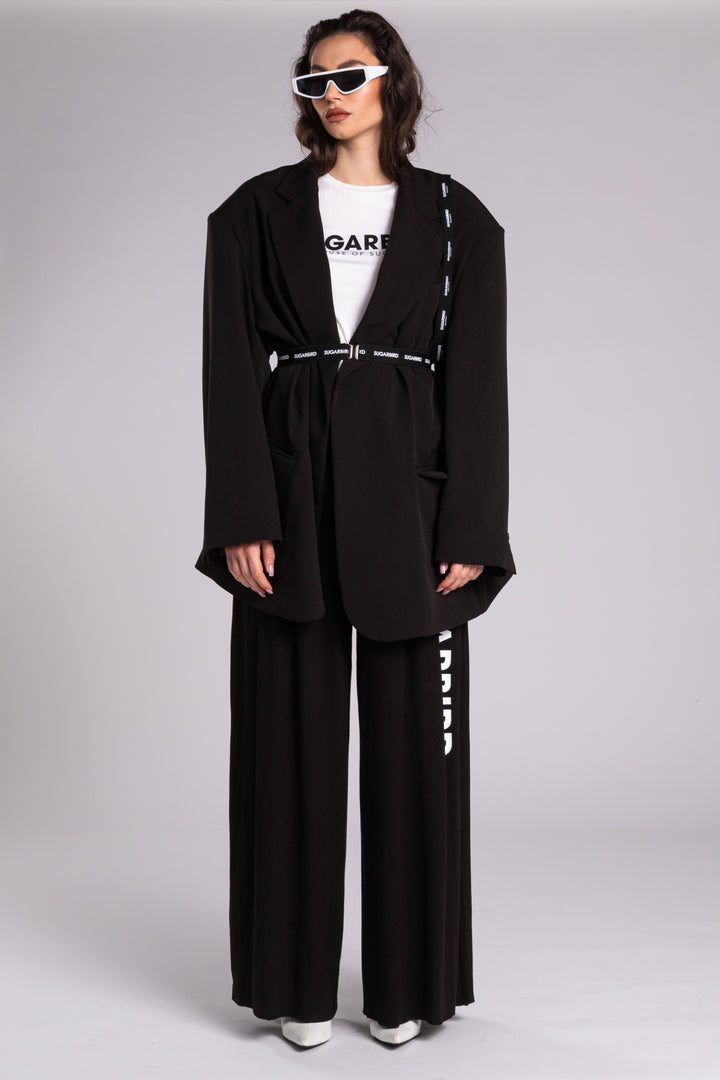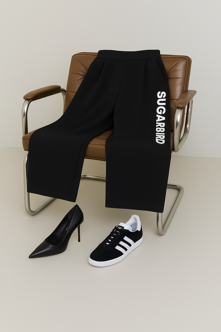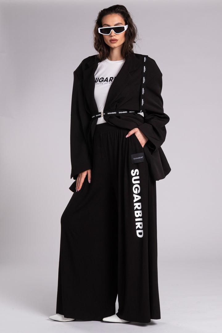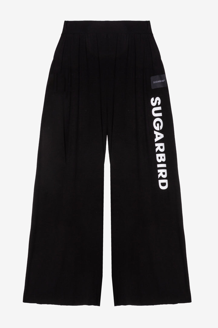 Maxi hosszúságú, széles, gumizott derekú, bő szárú nadrág. Eleje derekán hajtásokkal díszített, hátán pedig szűkítővel formázott. Oldalaiban svédzsebek, bal elején a zseb mellé nagy SUGARBIRD címkét varrtunk.