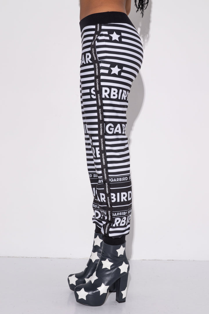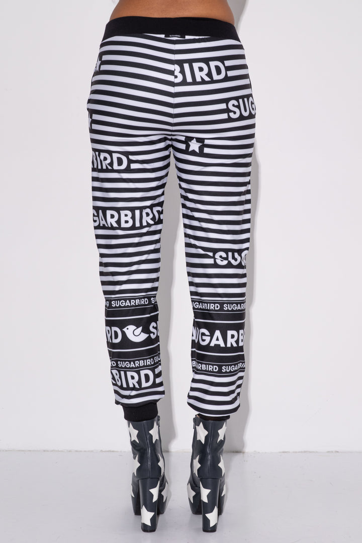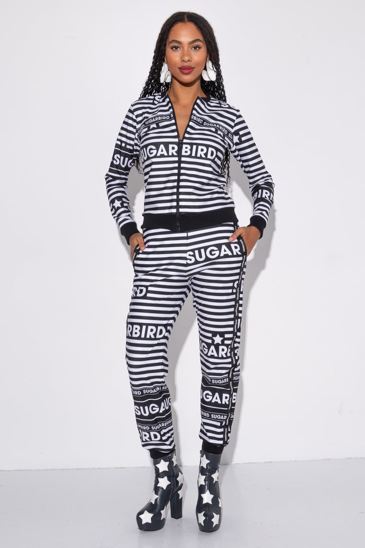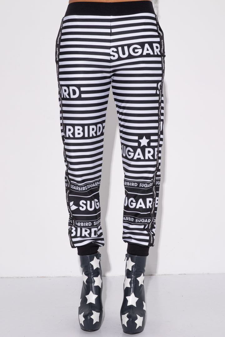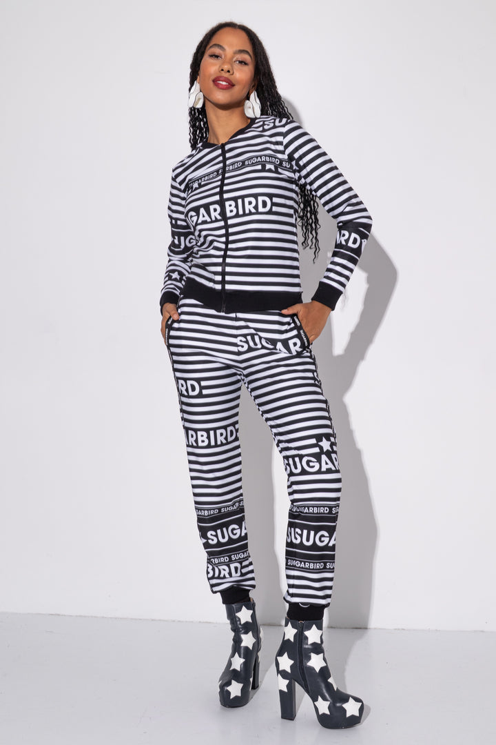 Kollekción darabjait fekete és fehér csíkos alapon SUGARBIRD feliratok printelt mintája díszíti.