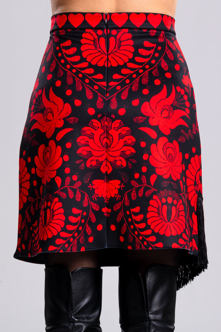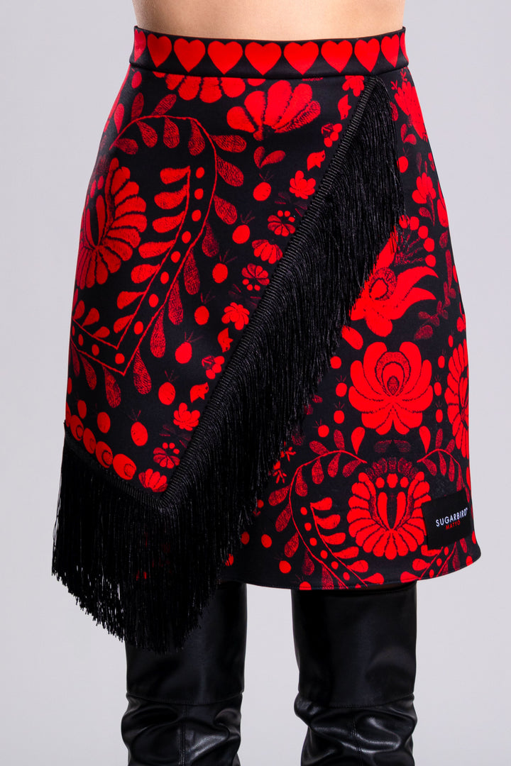 Combközép hosszúságú, enyhén bővülő, aszimmetrikus szoknya. Elején az átlapolás szélét széles, rojtos kellék díszíti. Háta közepén zipzárral nyitható. Elejére SUGARBIRD MATYÓ feliratú címkét varrtunk.