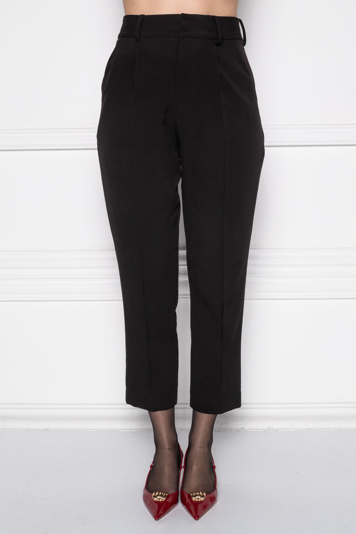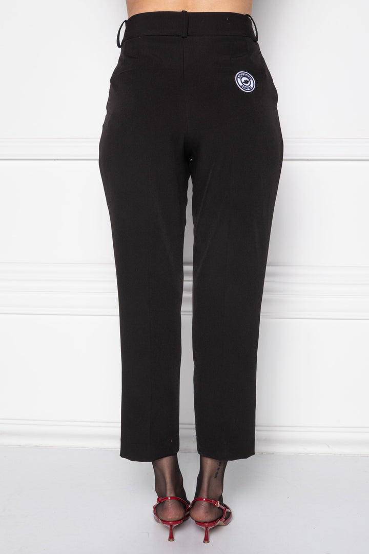 Capri hosszúságú, svédzsebes deréknadrág. Elején zipzáras hasítékkal és gombokkal záródik, alját széles felhajtással zártuk le. A nadrág hátán szűkítők formázzák és a szárakon él vasalás díszíti, melyet elől dísztűztünk.