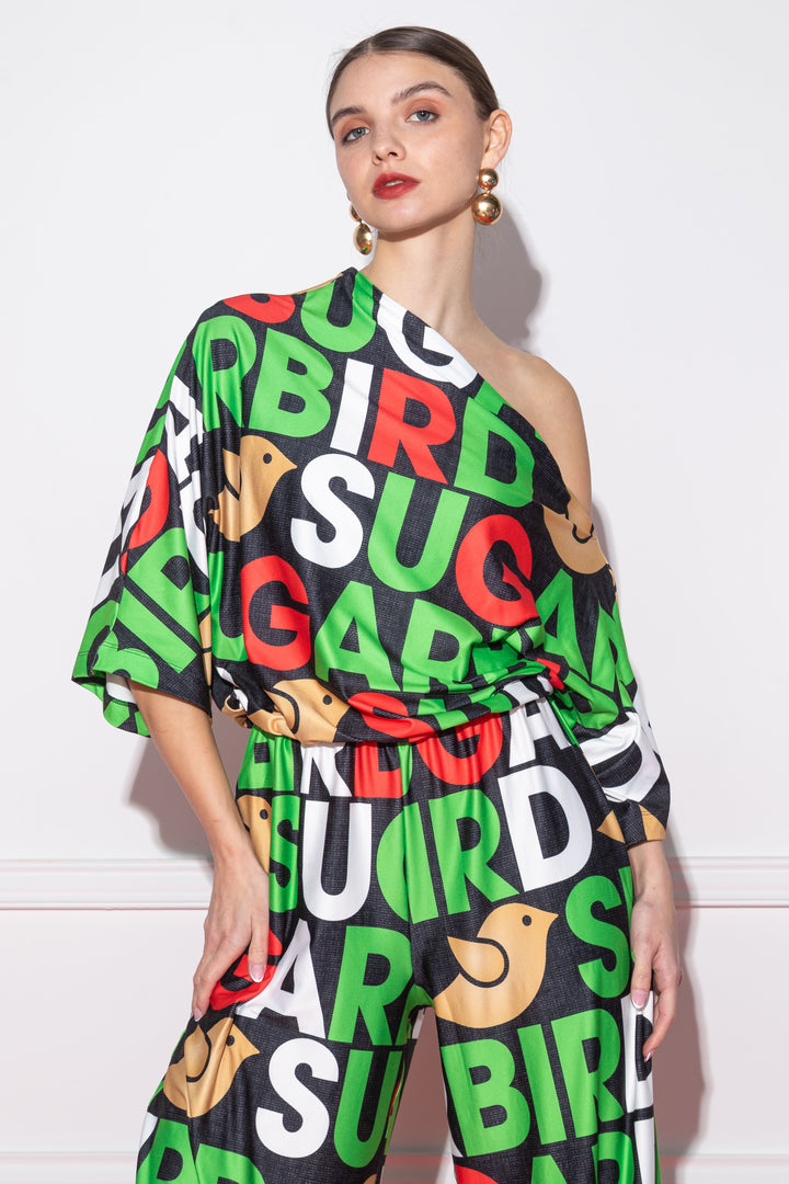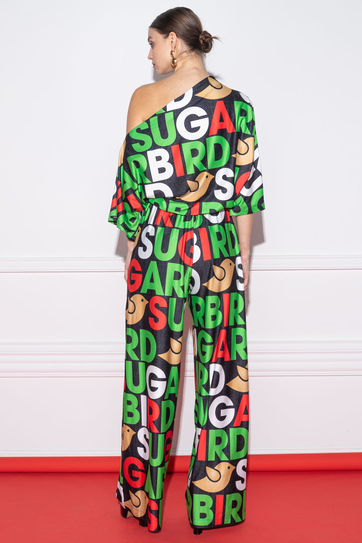 Háromnegyedes ujjú, hosszú és bő szárú, félvállas, laza fazonú overál. Dereka gumizott, bal vállán rejtett zipzárral nyitható. Ujjára SUGARBIRD feliratú címkét varrtunk.