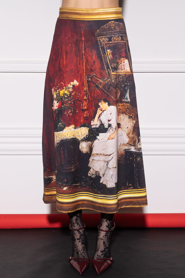 Vádliközép hosszúságú, bővülő „A” vonalú szoknya. Derekát félbehajtott pánt szegi, elején SUGARBIRD feliratú címke díszíti.