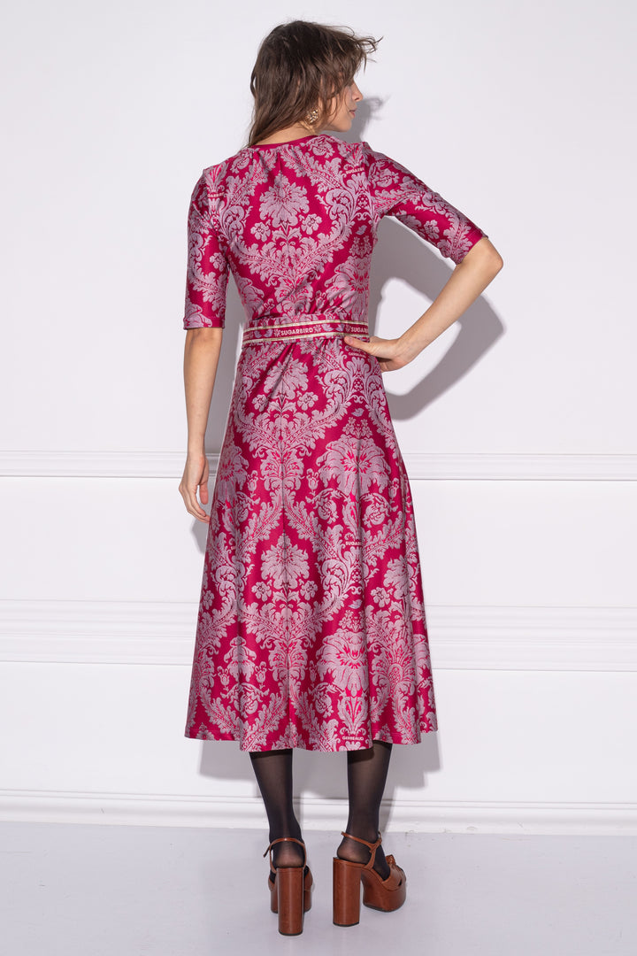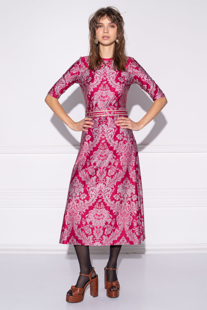 Háromnegyedes ujjú, vádliközép hosszúságú, alak követő ruha. Zárt kerek nyaka félbehajtott pánttal szegett. Szoknya része bővülő „A” vonalú.
