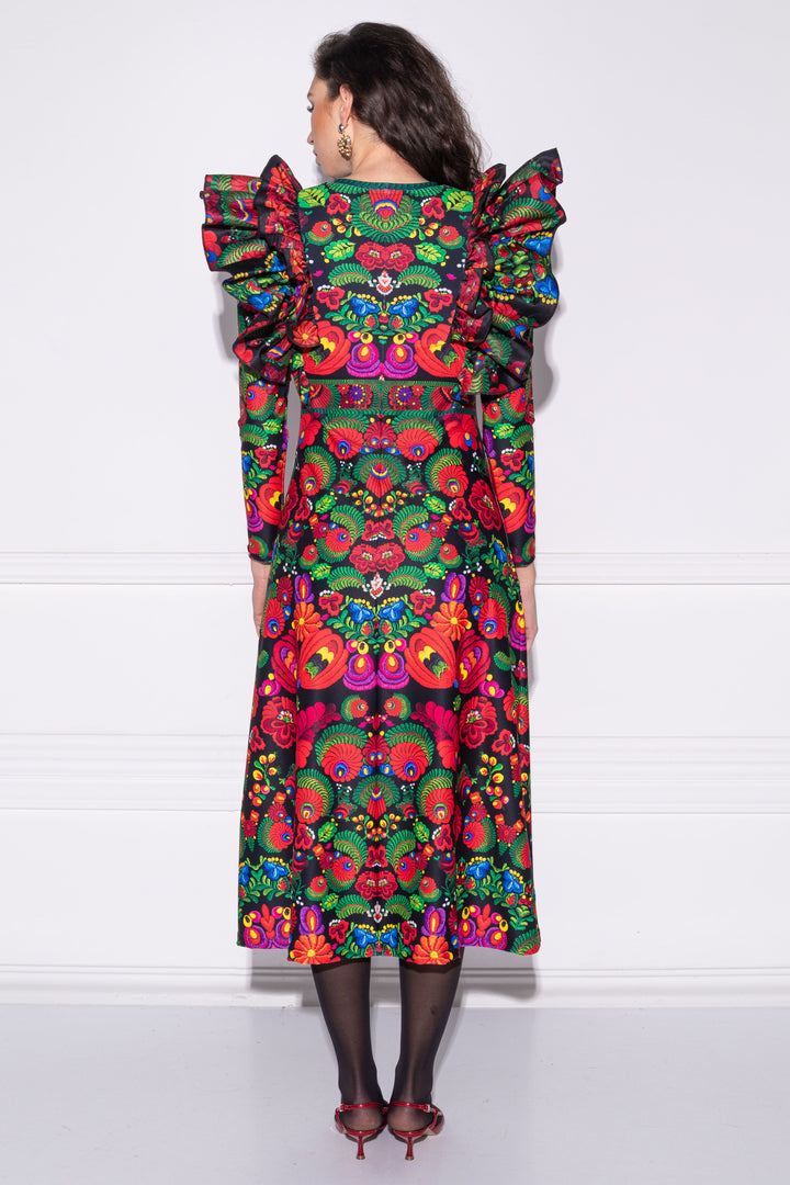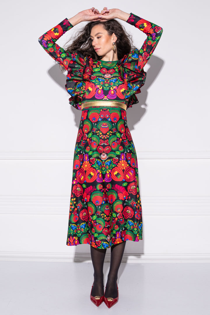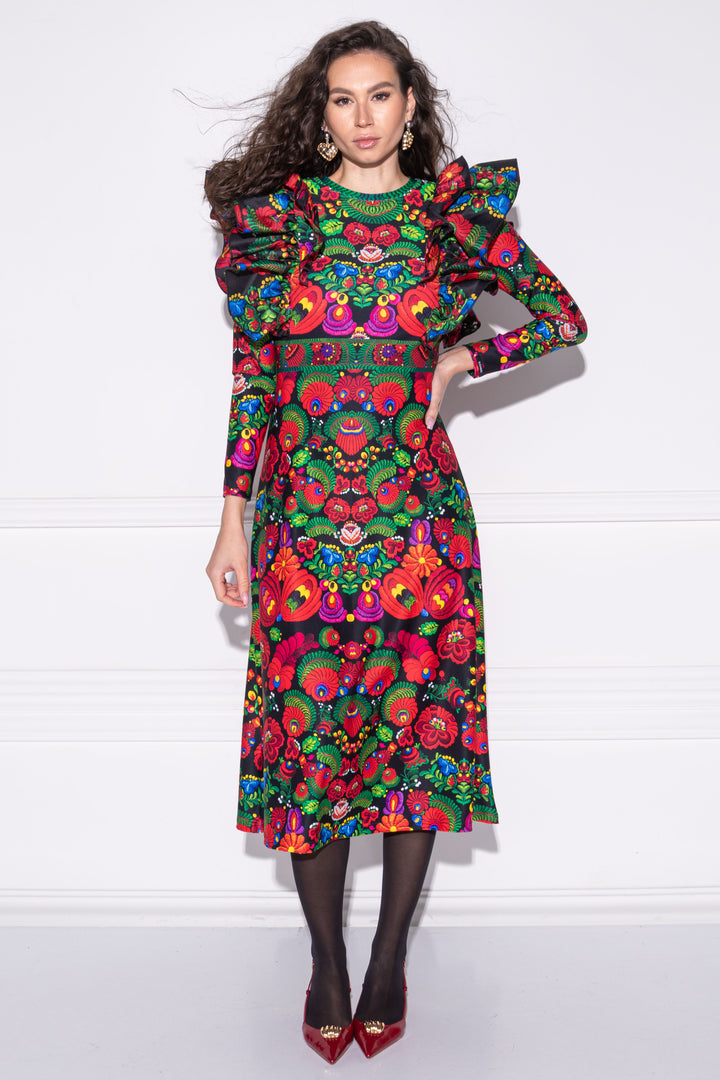 Hosszú ujjú, vádliközép hosszúságú, alak követő ruha. Zárt kerek nyaka félbehajtott pánttal szegett. Szoknya része bővülő „A” vonalú. Vállait két-két széles, húzott fodor díszíti. Ujjára SUGARBIRD feliratú címkét varrtunk.