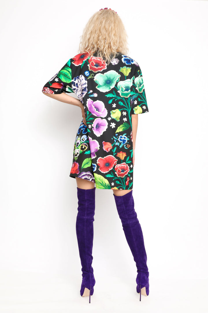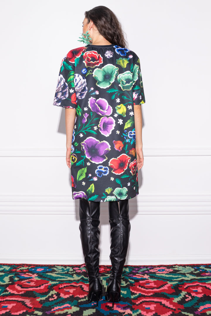 Rövid ujjú, laza és egyenes fazonú, térd felett érő tunika. Zárt kerek nyaka félbehajtott pánttal szegett. Hosszú kötőjével derékra szűkíthető a fazon. Elejére SUGARBIRD LOVES FRIDA KAHLO feliratú címkét varrtunk.