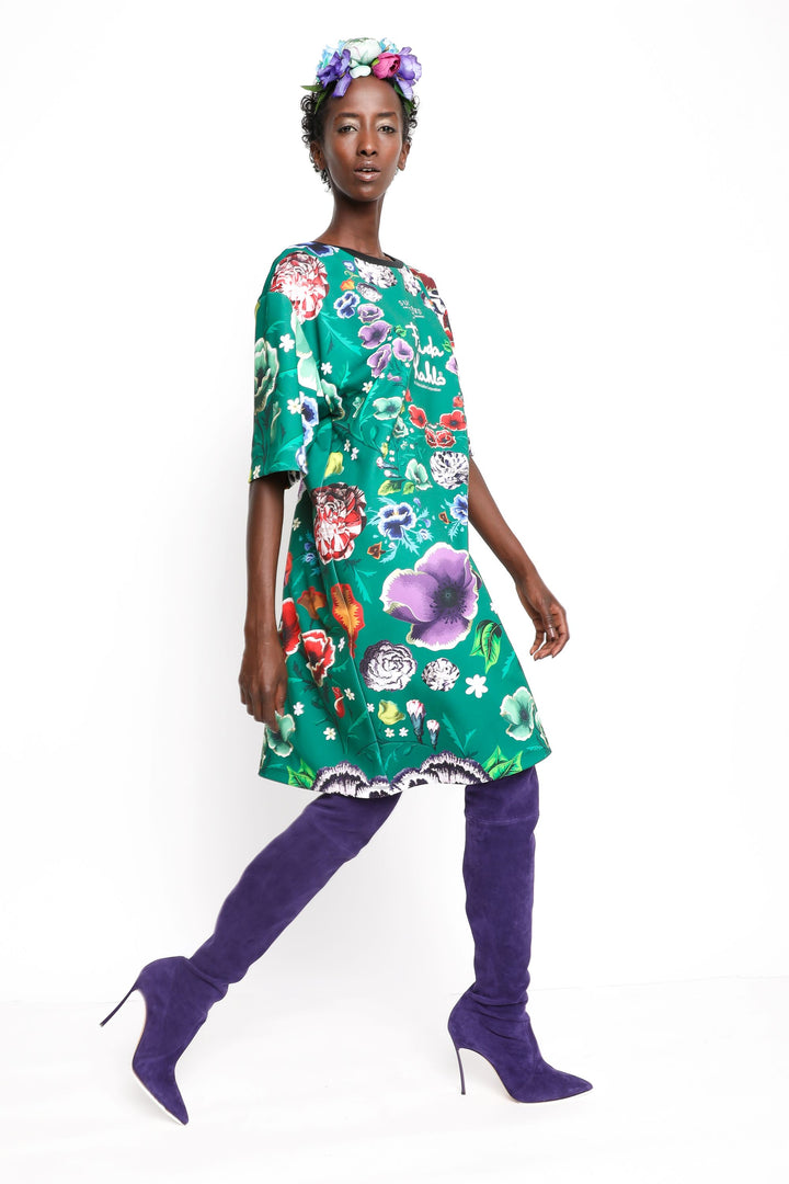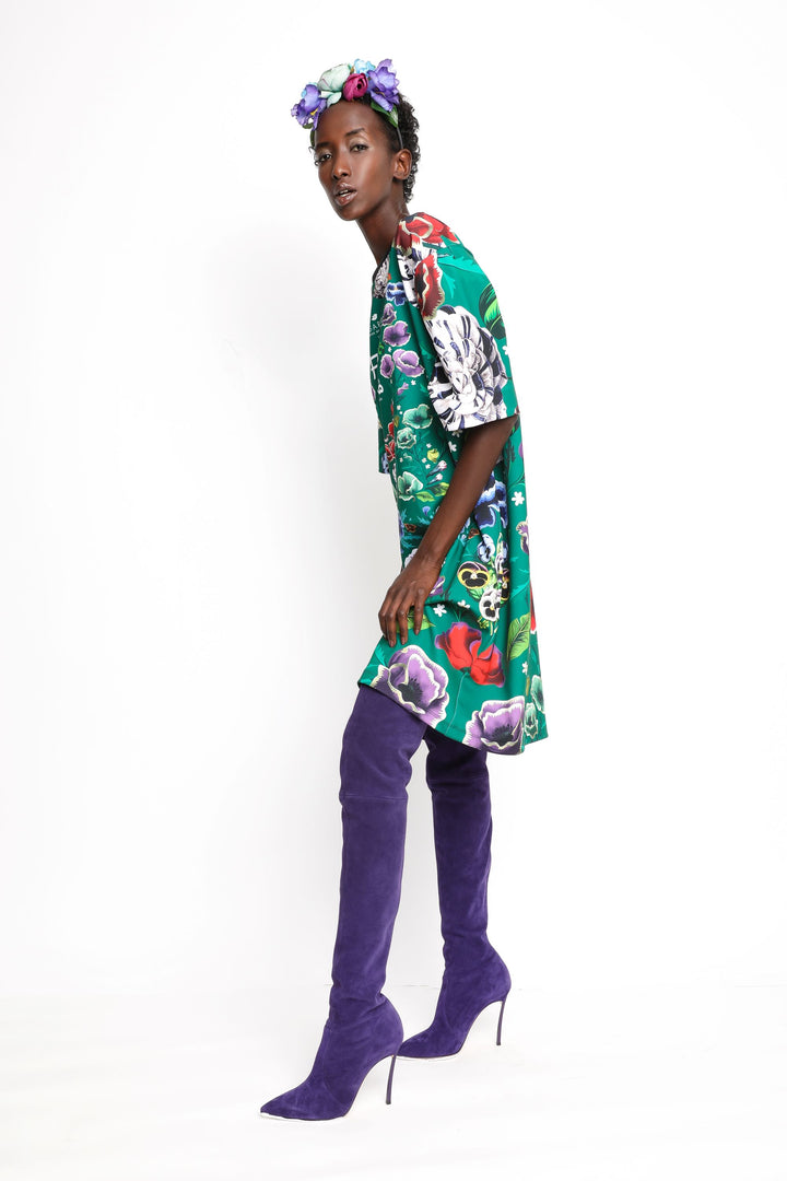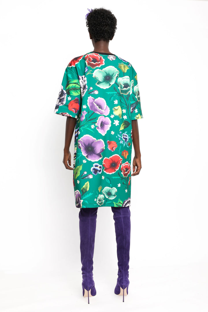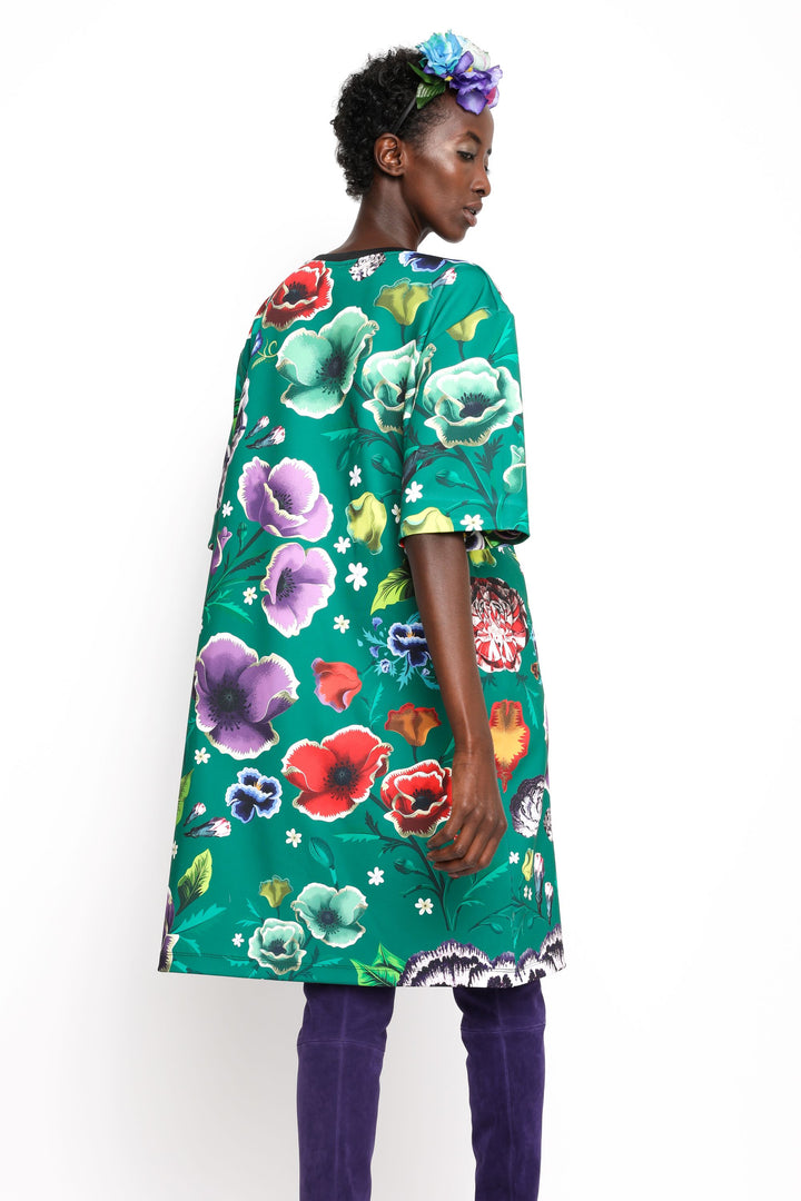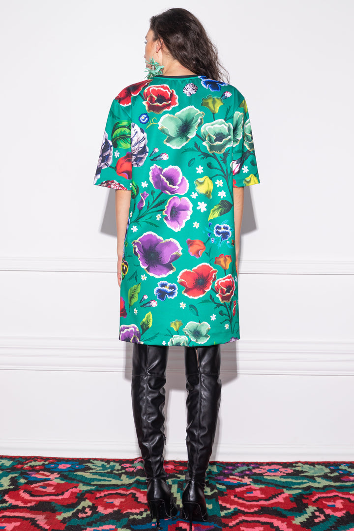 Rövid ujjú, laza és egyenes fazonú, térd felett érő tunika. Zárt kerek nyaka félbehajtott pánttal szegett. Hosszú kötőjével derékra szűkíthető a fazon. Elejére SUGARBIRD LOVES FRIDA KAHLO feliratú címkét varrtunk.