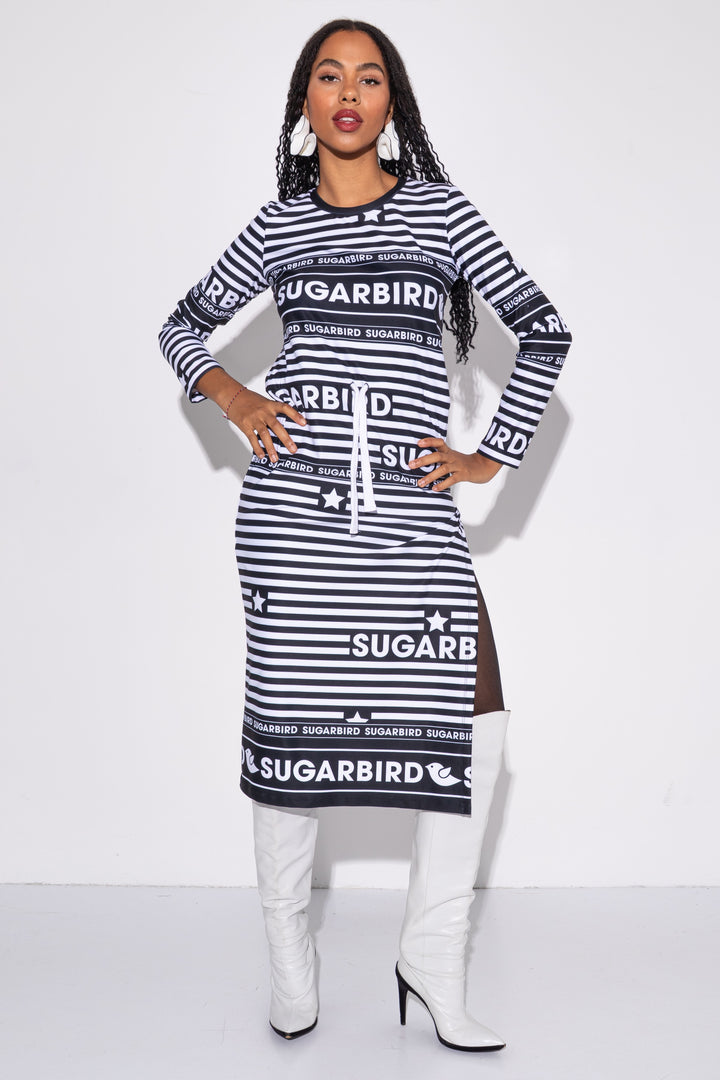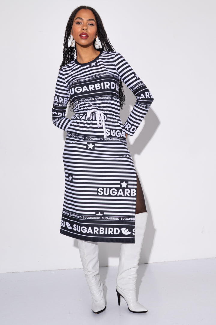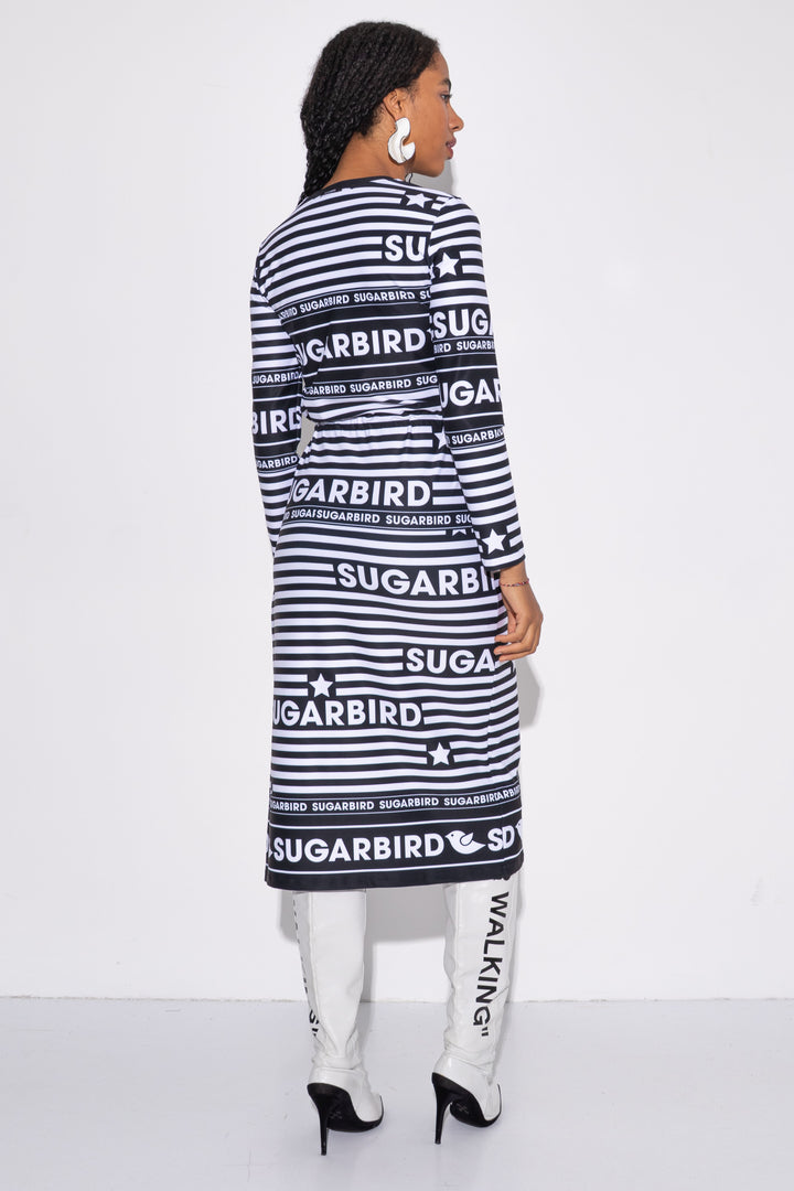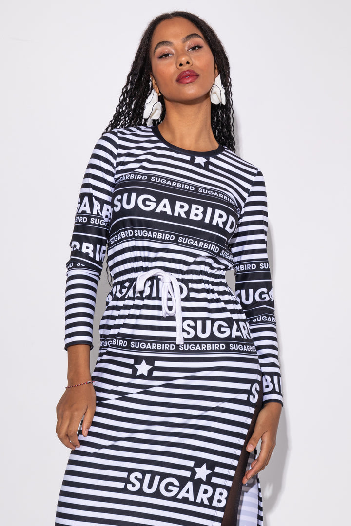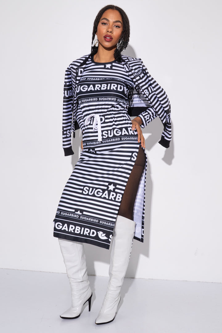 Kollekción darabjait fekete és fehér csíkos alapon SUGARBIRD feliratok printelt mintája díszíti.
