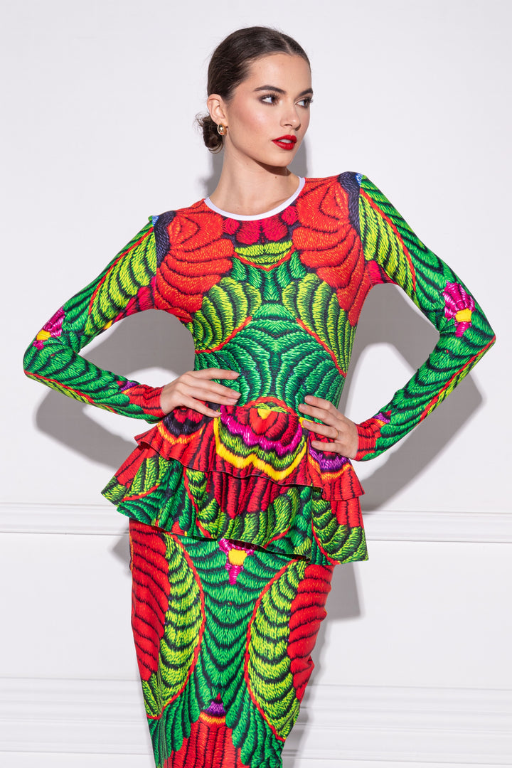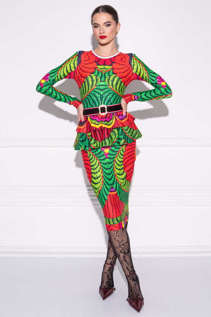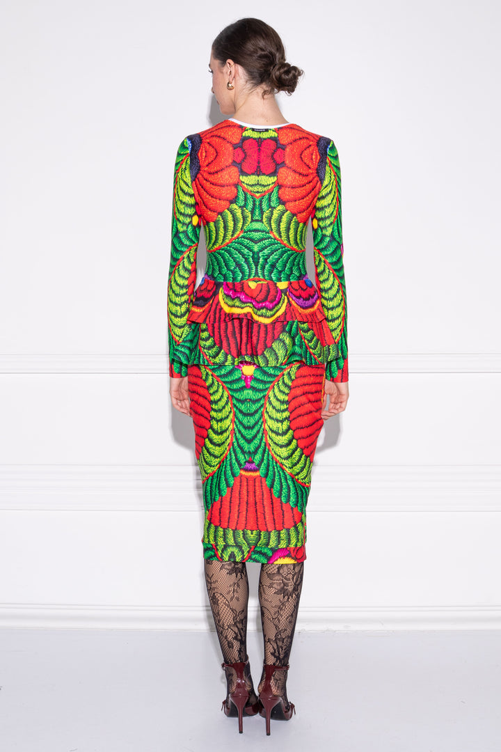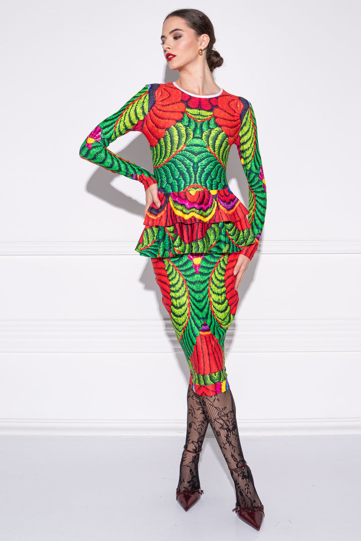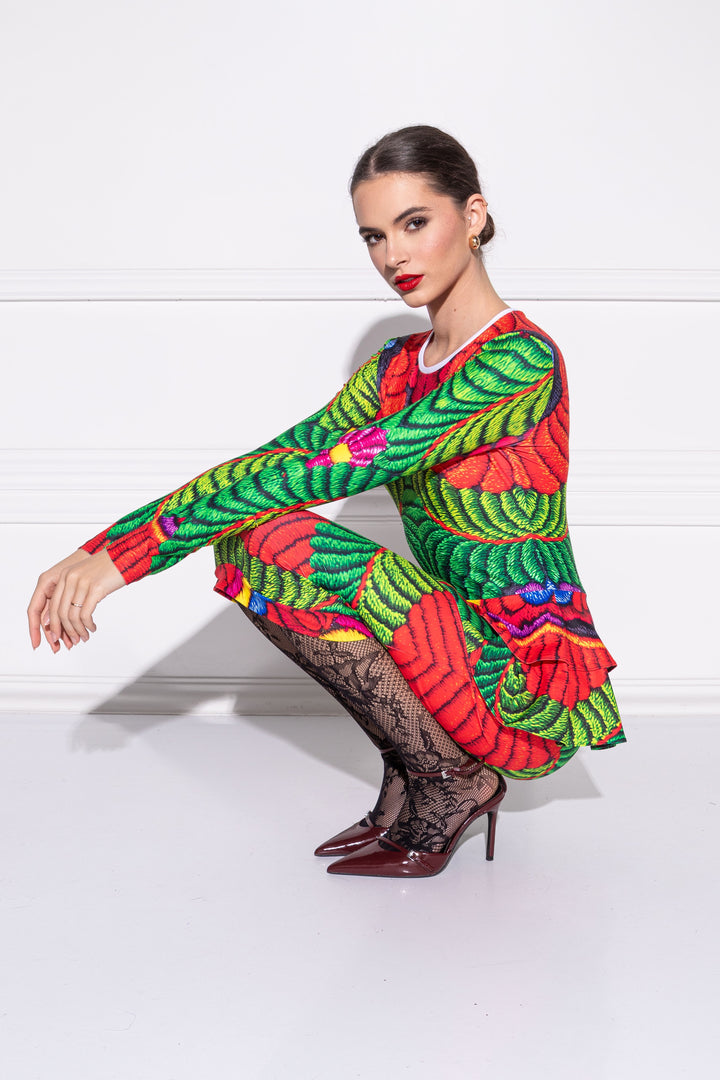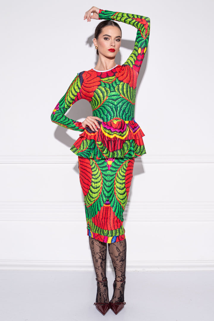 Hosszú ujjú, alak követő, térd alatti hosszúságú ruha. Kerek nyakköre keskeny, félbe hajtott pánttal szegett. Derekát dupla és széles fodrok díszítik. Hátára SUGARBIRD feliratú címkét varrtunk.