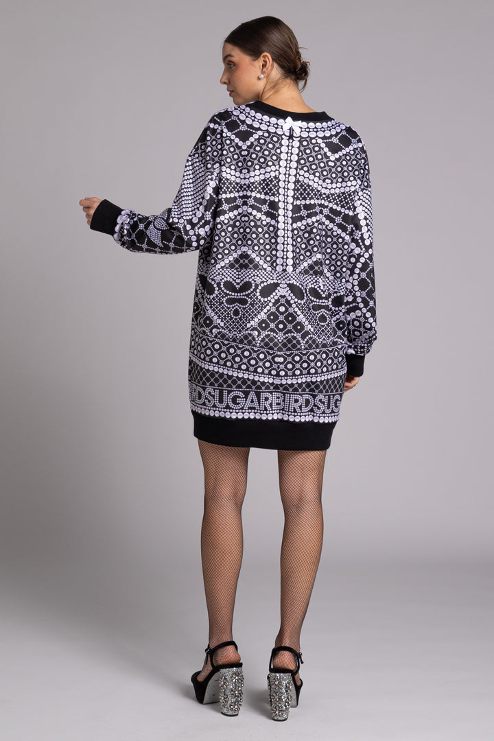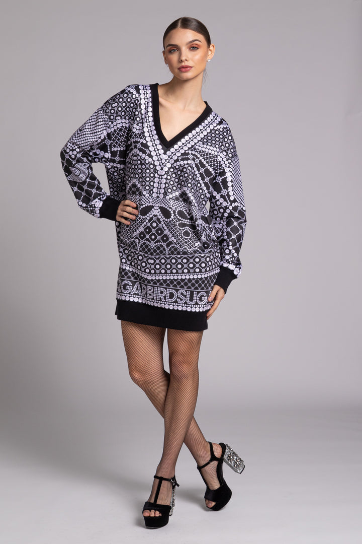 Hosszú ujjú, combközép hosszúságú, laza fazonú pulóver. Alja, ujja alja és mély „V” alakú nyakkivágása passzé anyagú pántokkal szegett. Hátán fehér masnis kellék és SUGARBIRD feliratú címke díszíti.