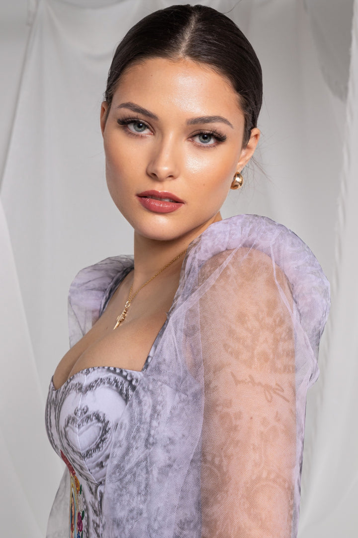 Térd alatti hosszúságú, hosszú és puffos ujjú, alak követő ruha. Mellrésze szabott, hátán a vállait keskeny, állítható pánt köti össze. Vállai húzottak, ujja alja gumizott. Háta közepén felül, valamint alul a hasíték zipzárral nyitható. Elejére SUGARBIRD feliratú címkét varrtunk.