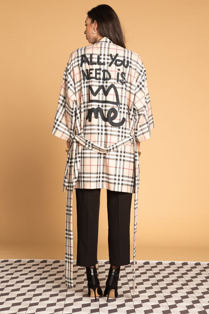 Oversize, térd fölé érő, hosszú ujjú kaftán. Hosszú övének köszönhetően derékra szűkíthető a fazon. Oldalát kétoldalt hasíték, ujját SUGARBIRD QUEEN ME feliratú címke díszíti.