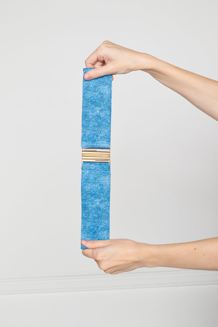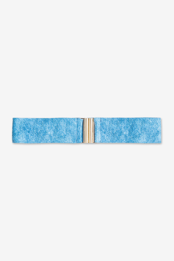 Arany színű övcsattal záródó, széles, nyomott mintás, gumis öv.