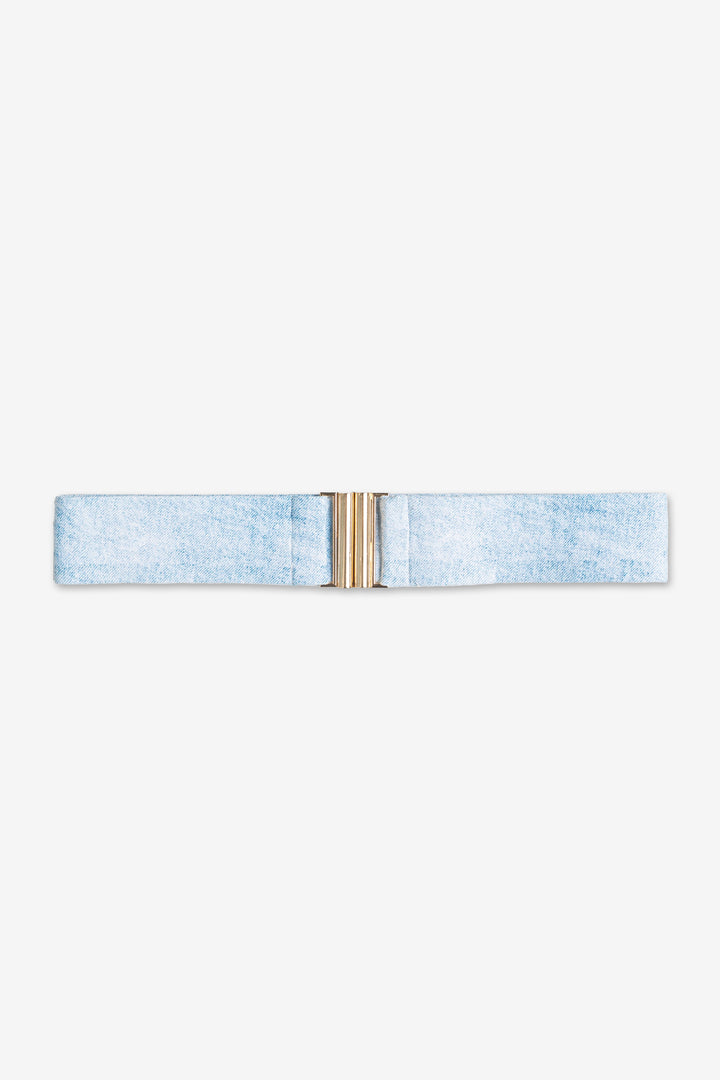 Arany színű övcsattal záródó, széles, nyomott mintás, gumis öv.