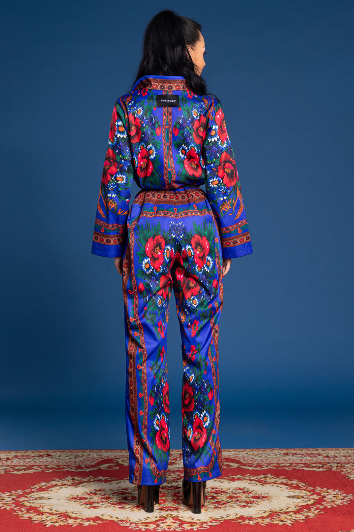 Long and straight-leg, long-sleeved, loose-fitting overalls. Concealed zipper at the front, tailored collar. Long and narrow drawstring to narrow the waist. Back SUGARBIRD decorated with a label.