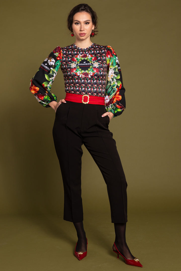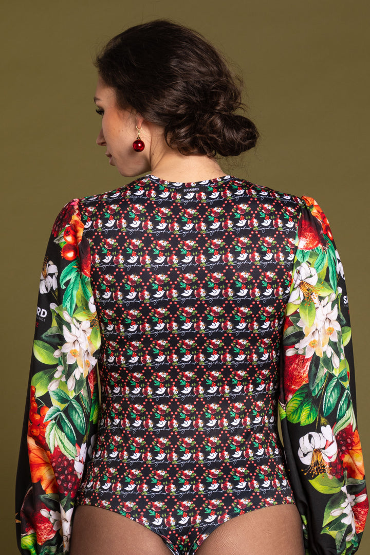 Long and puffy sleeve, form-fitting bodysuit. Elasticated thigh bottom with adjustable snap closure. Closed and round neck with narrow strap. Back SUGARBIRD We sewed a label with the inscription.