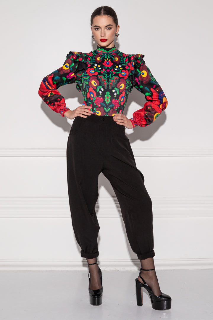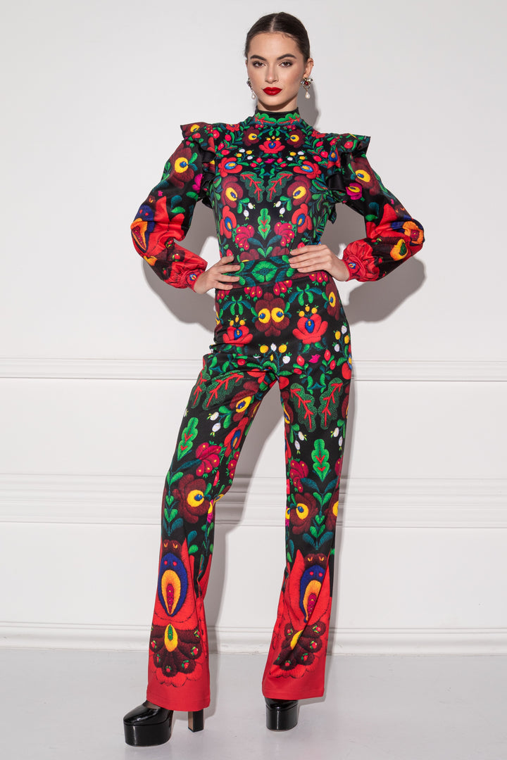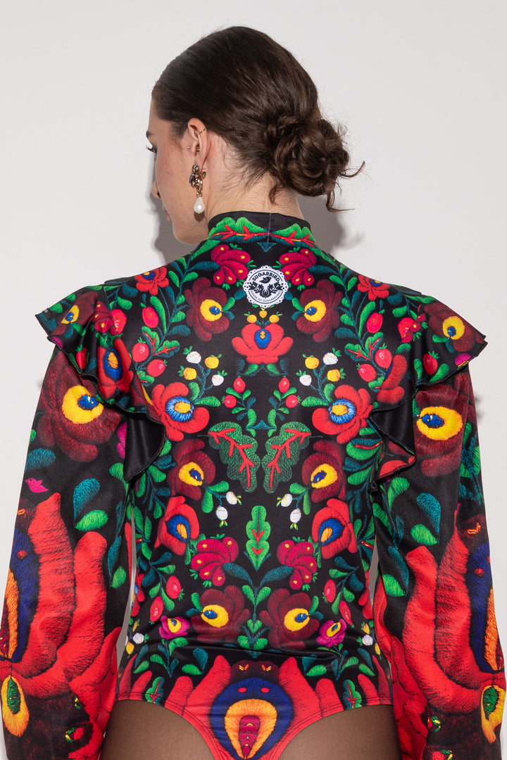 Long, puffy, form-fitting bodysuit. The neck and bottom of the sleeves are edged with a wide band, and the cuffs are decorated with a ruffle. It closes at the bottom with an elasticated thigh section and an adjustable snap. The ruffle