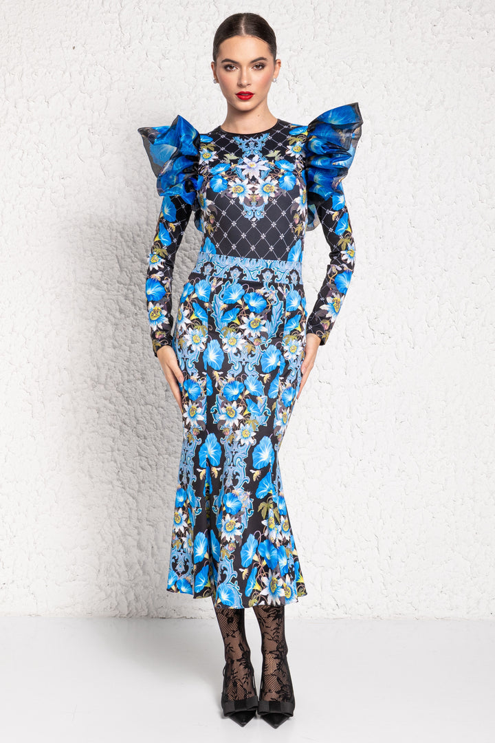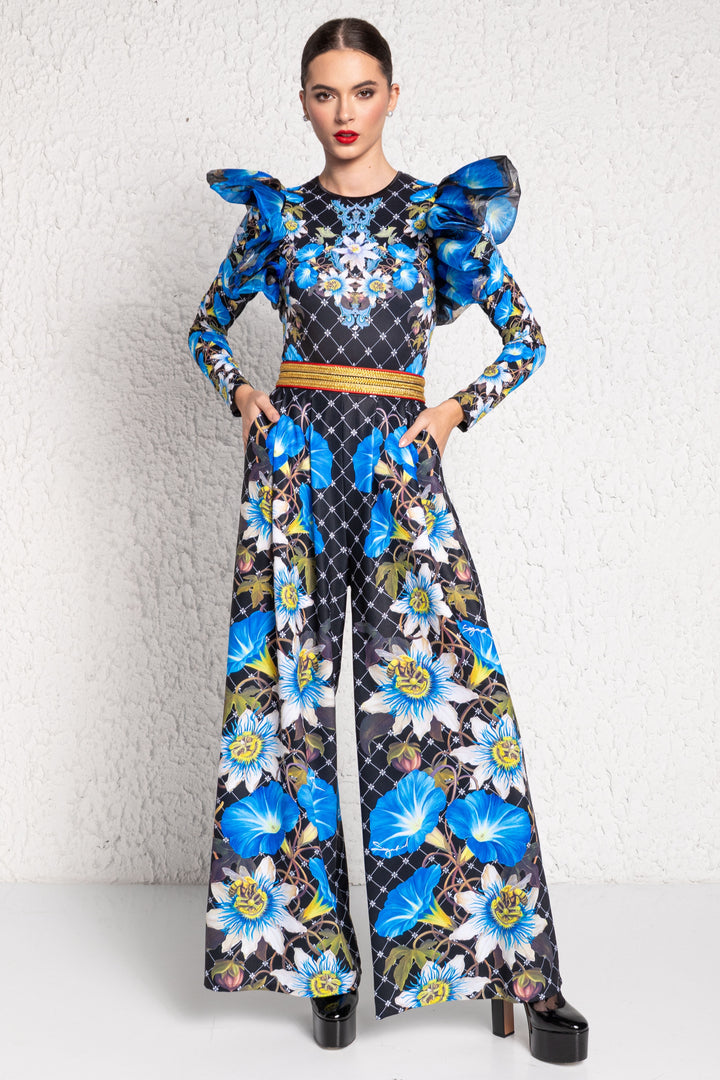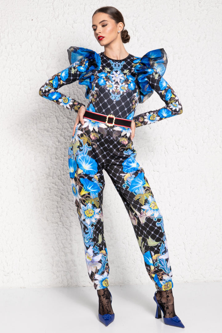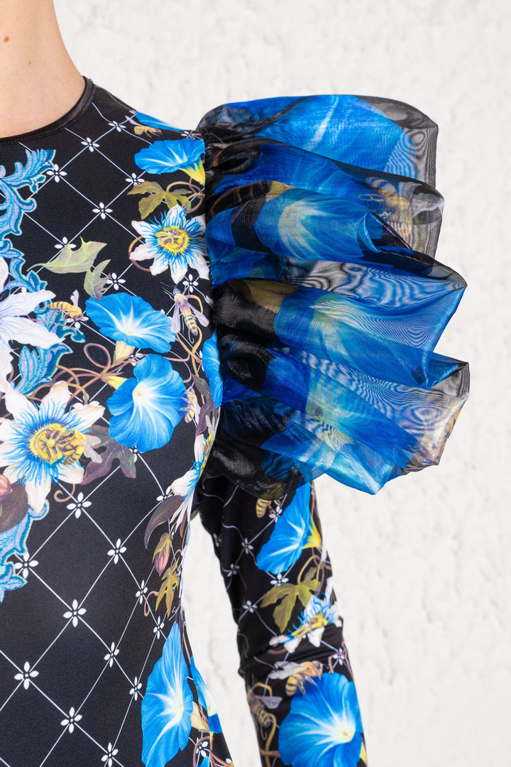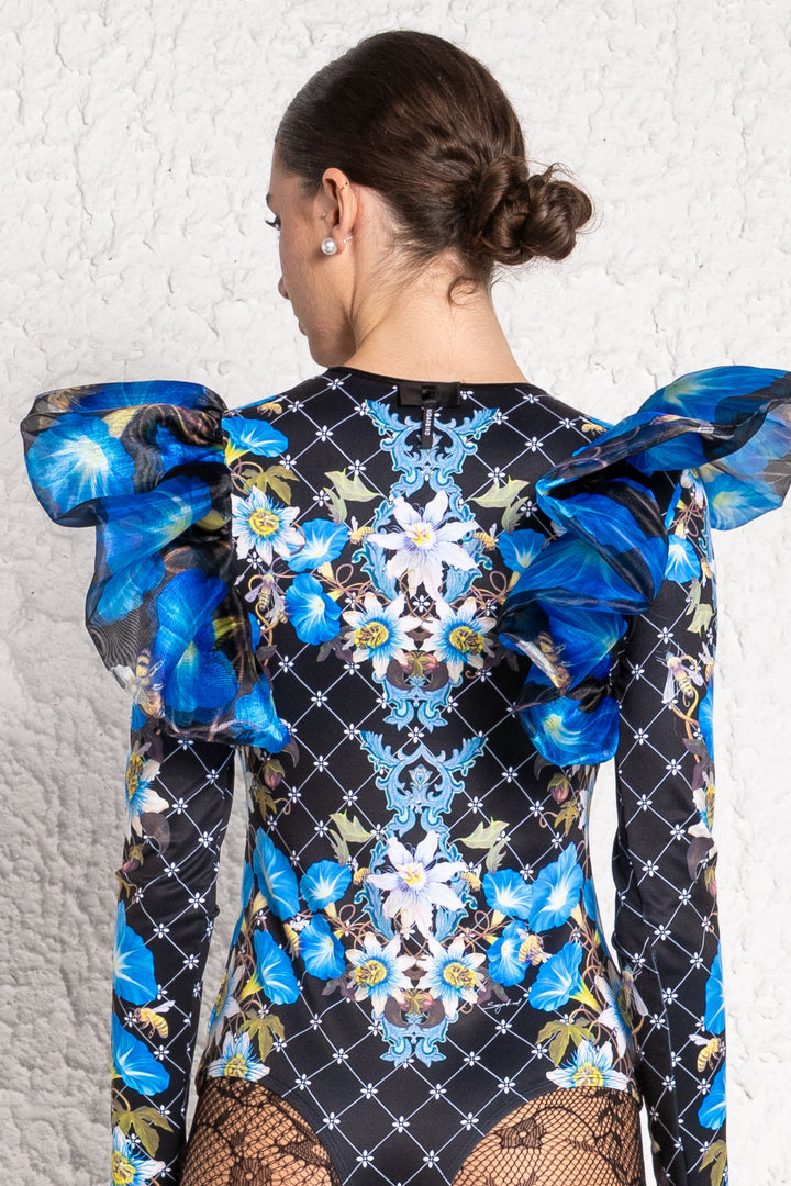 Long-sleeved, form-fitting bodysuit. Elasticated thigh at the bottom and adjustable snaps at the bottom. The closed neckline is edged with a narrow strap. The shoulders are decorated with wide, drawn ruffles. On the back