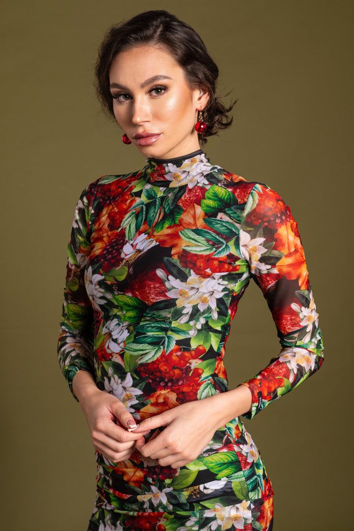 Long-sleeved, mid-calf-length, form-fitting dress. High, turtleneck and hem edged with a narrow strap. Pulled on both sides at the hips, opens with a zipper in the middle of the back. Sleeves SUGARBIRD We sewed a label with the inscription.