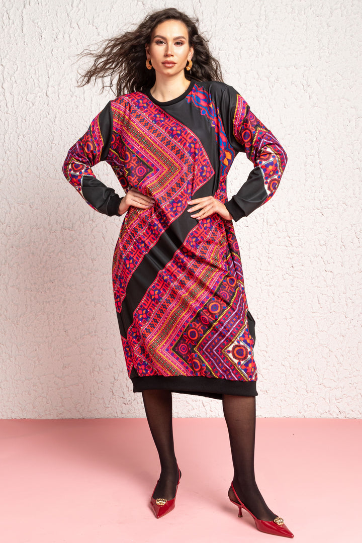 A below-the-knee, long-sleeved, loose-fitting dress. The sleeves are shaped by pleats, and the bottom, bottom of the sleeves and the round neckline are edged with folded, fitted straps. We have placed pockets on the sides. On the back