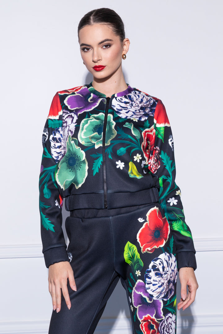 Long-sleeved, waist-length, straight-cut jacket. Round neck with tailored collar. Elastic waistband and cuffs, center front zip. Back
