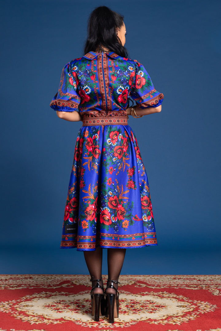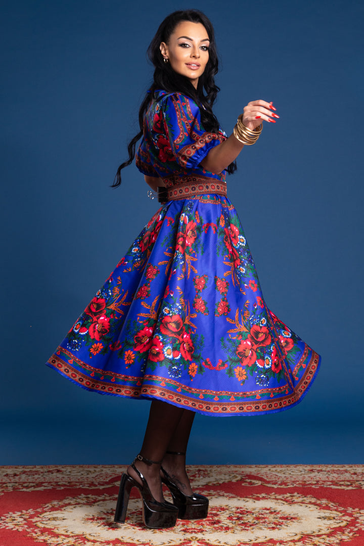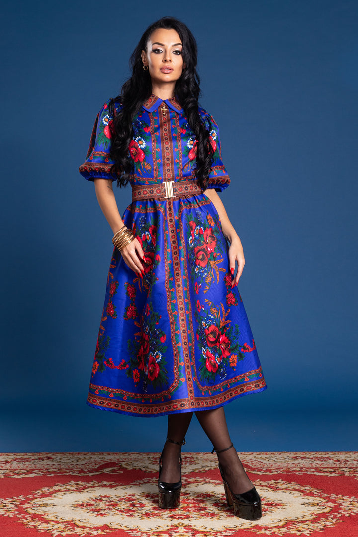 Mid-calf length dress with three-quarter length and puff sleeves. The neck is fitted with a collar and the back is open with a zipper. It is narrowed at the waist, the skirt is richly drawn and flares downwards. To the front