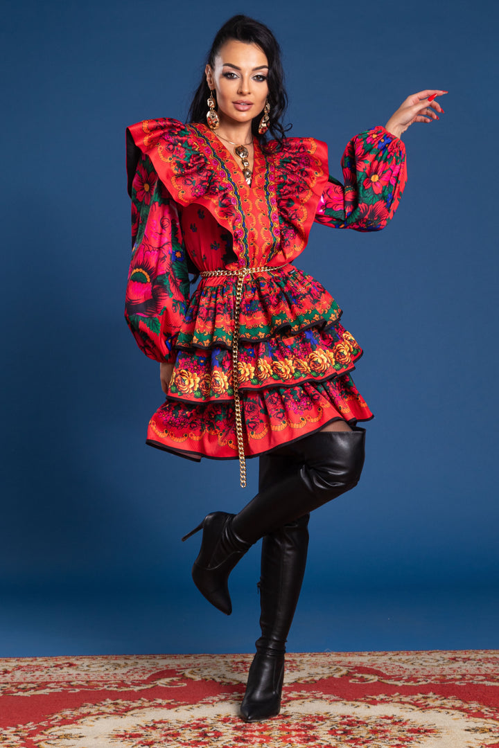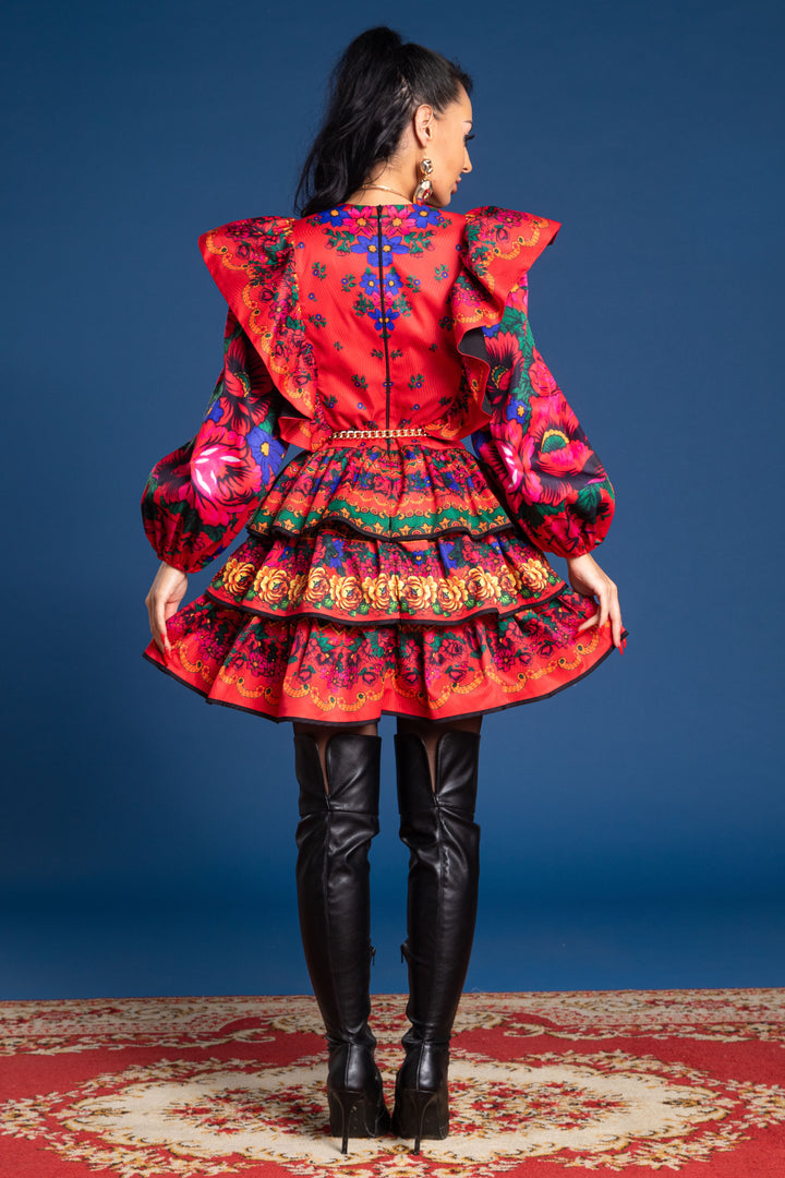 Long, puffy, mid-thigh length, lined dress. V-neck at the front, wide ruffles on the skirt and top. Zipper in the middle of the back, elasticated cuffs. Left front side SUGARBIRD decorated with a label.
