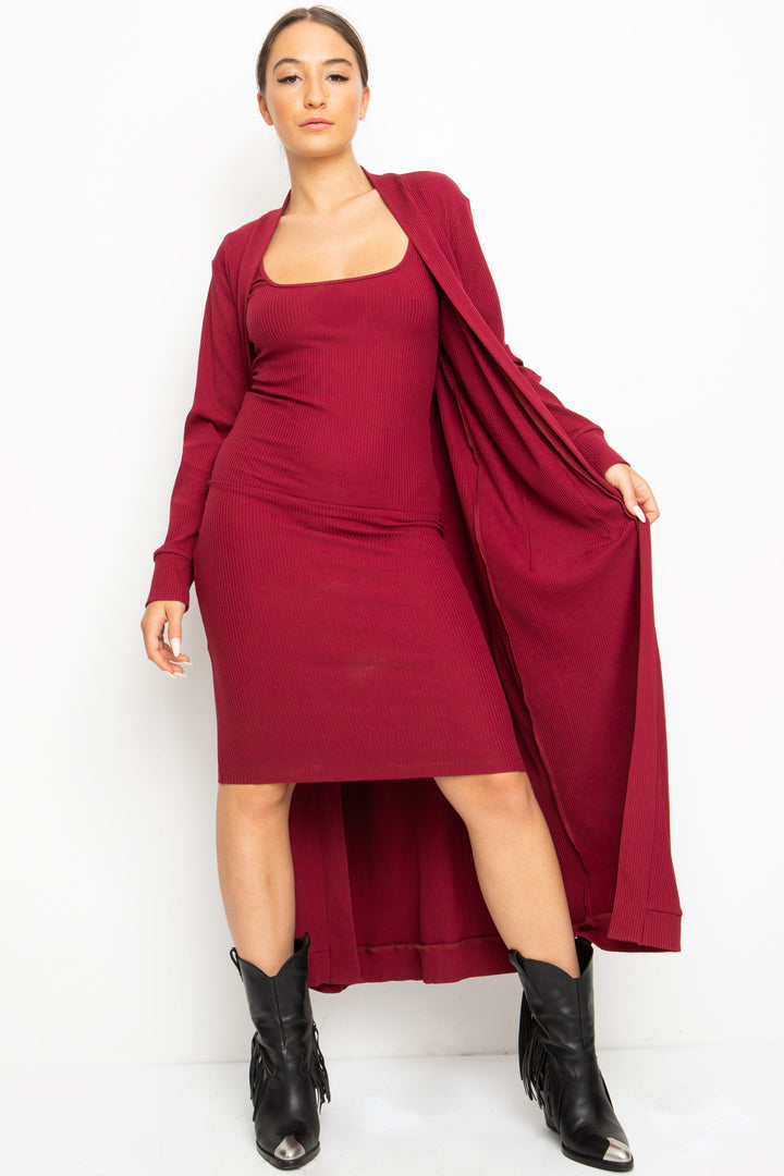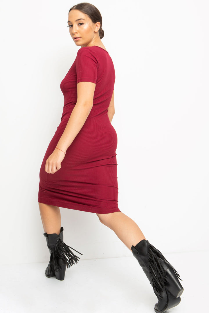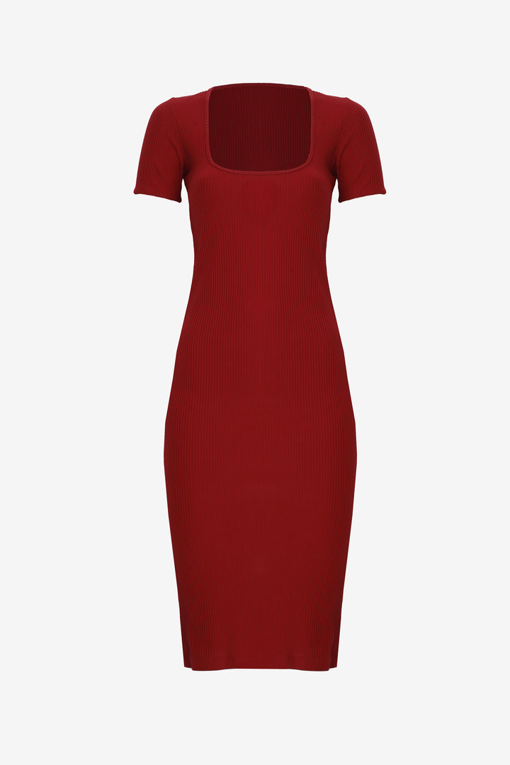 Rövid ujjú, térd alá érő, alak követő ruha. Nyaka mélyen dekoltált, melyet keskeny pánt szeg.