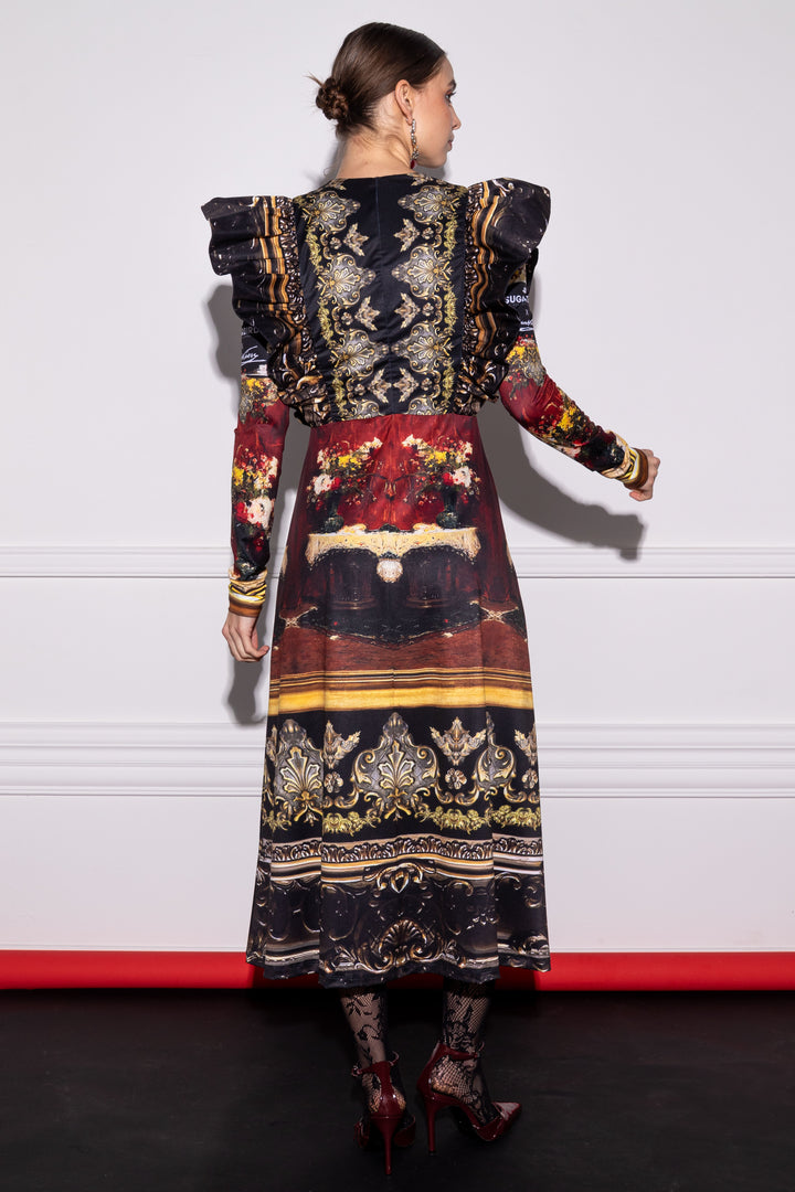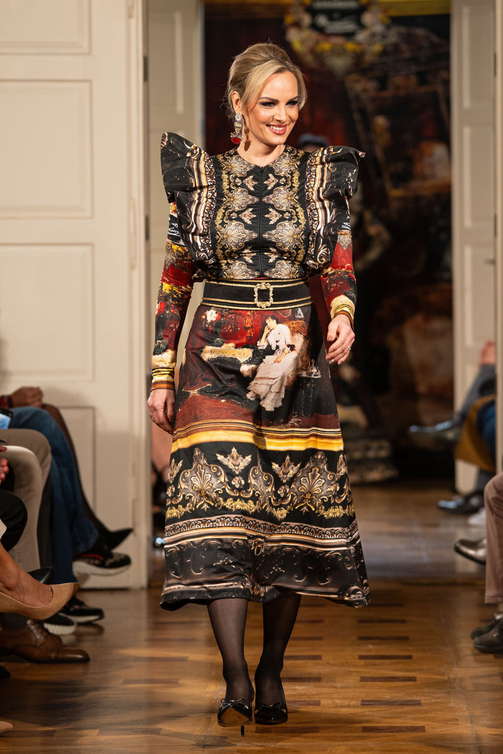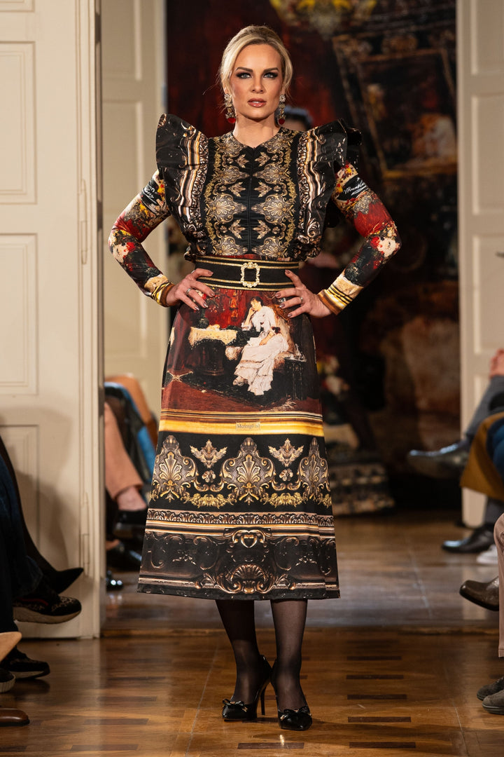 Térd alatti hosszúságú, hosszú ujjú ruha. Felső részén alak követő és bélelt, szoknyarészén bővülő, „A” vonalú. Vállait széles, húzott fodor díszíti. Eleje közepén, derékig zipzárral nyitható.