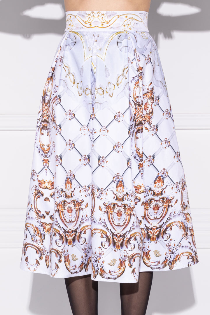 A-line skirt, below the knee length. The waist is shaped by pleats at the front and back. It opens with a zipper at the center of the back. The style is SUGARBIRD decorated with a label.