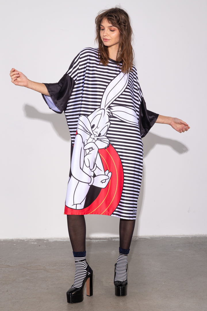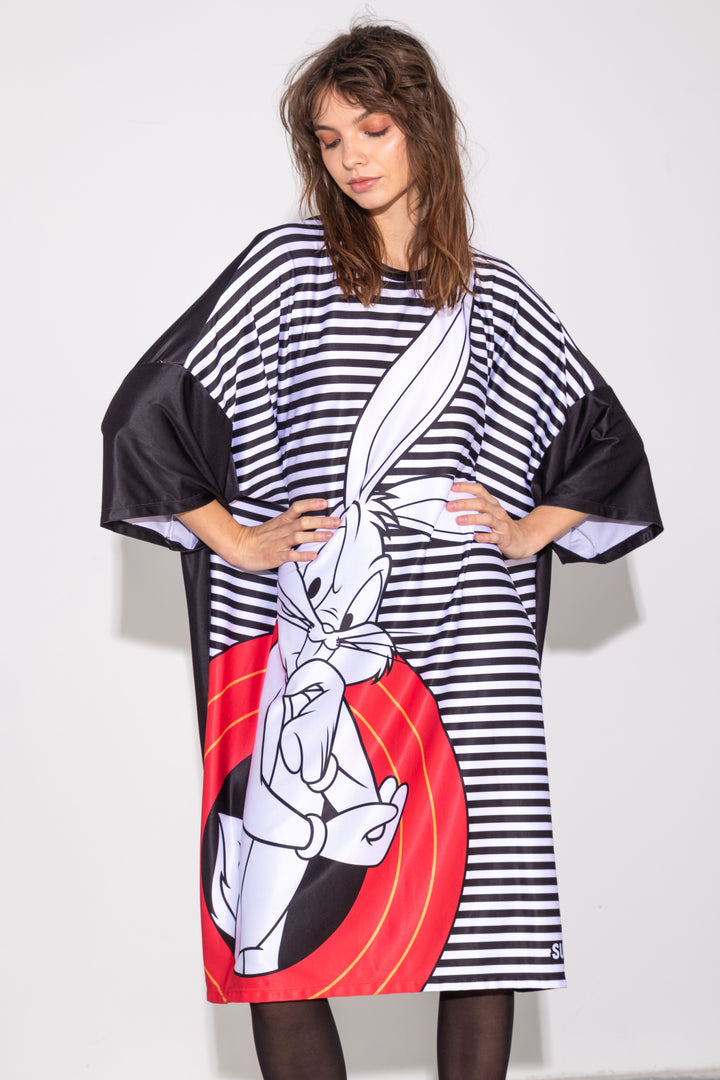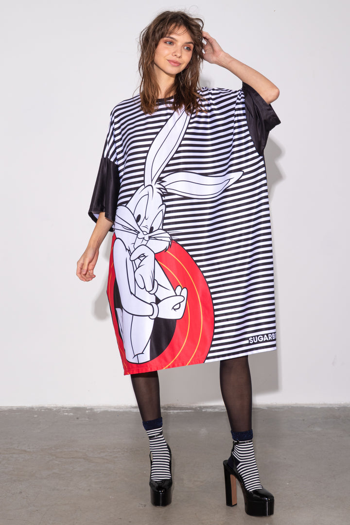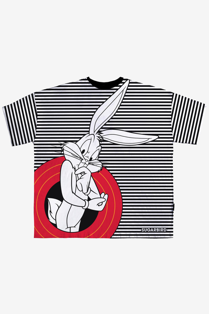 The popular styles of our Bugs Bunny collaboration are decorated with printed graphics of the iconic characters of the WARNER BROTHERS studio on a striped and black background.