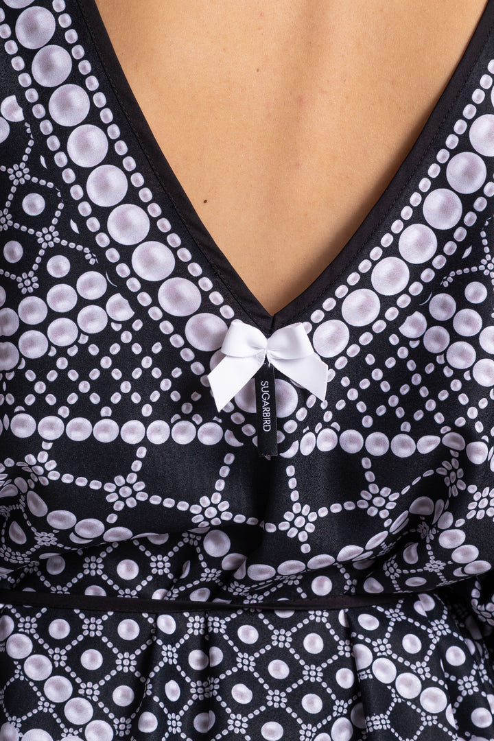 Let yourself be enchanted by festive pearls and festive glitter in our limited collection, the design of which is decorated with pearl motifs printed on a black background.