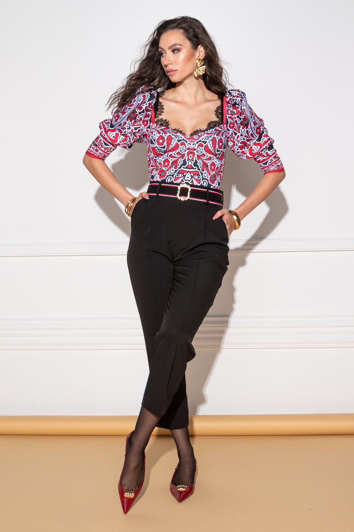 A form-fitting, lined bodysuit with puffy, three-quarter sleeves. The sleeves are edged with a wide strap, and the neckline is square and deep at the front. It closes at the bottom with an elasticated thigh section and an adjustable hook-and-eye fastener. On the sleeves