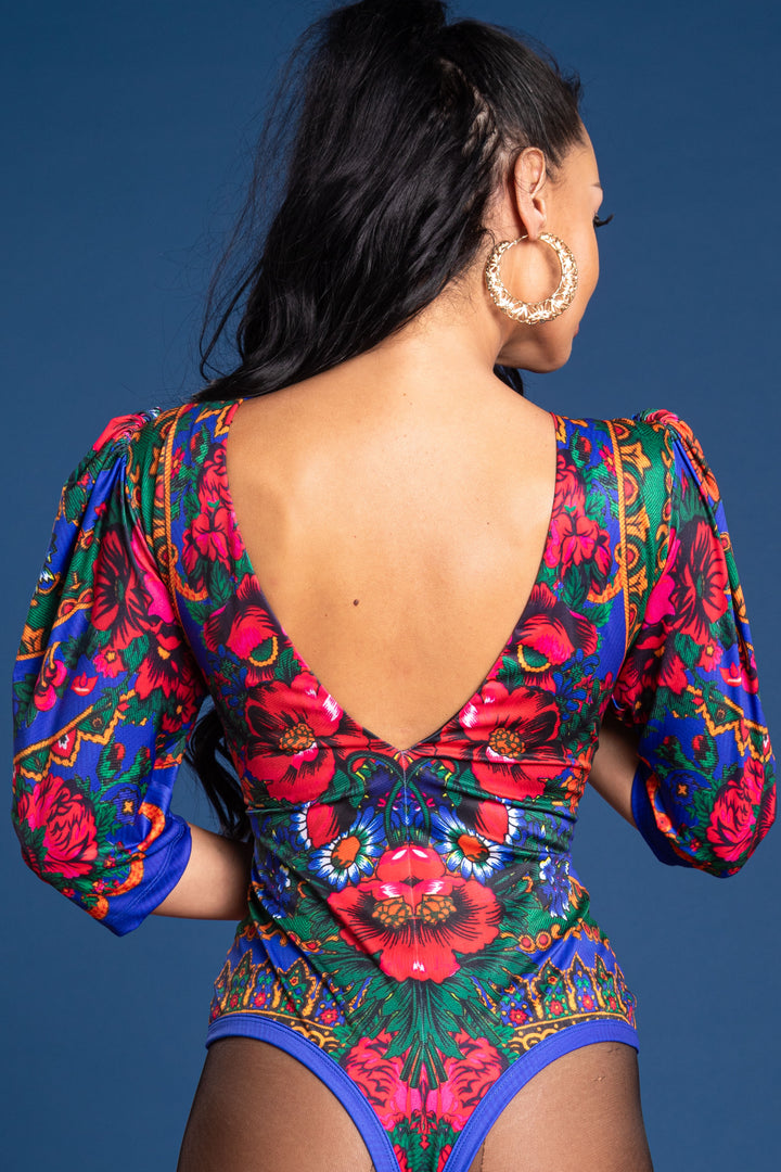 Three-quarter and puff sleeves, form-fitting bodysuit. The neck is curved at the front and cut in a deep "V" shape at the back. It closes at the bottom with an elasticated thigh section and an adjustable snap fastener. The front can also be worn at the back if desired. On the sleeve SUGARBIRD We sewed a label with the inscription.