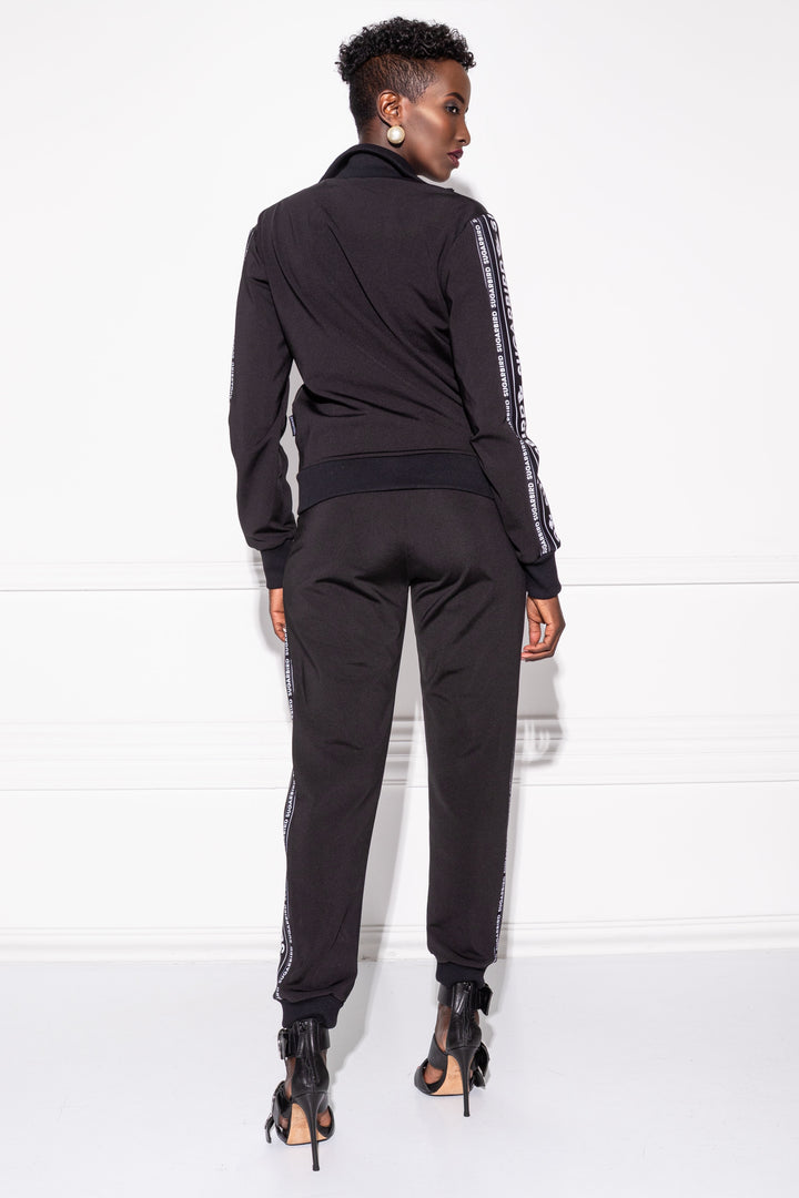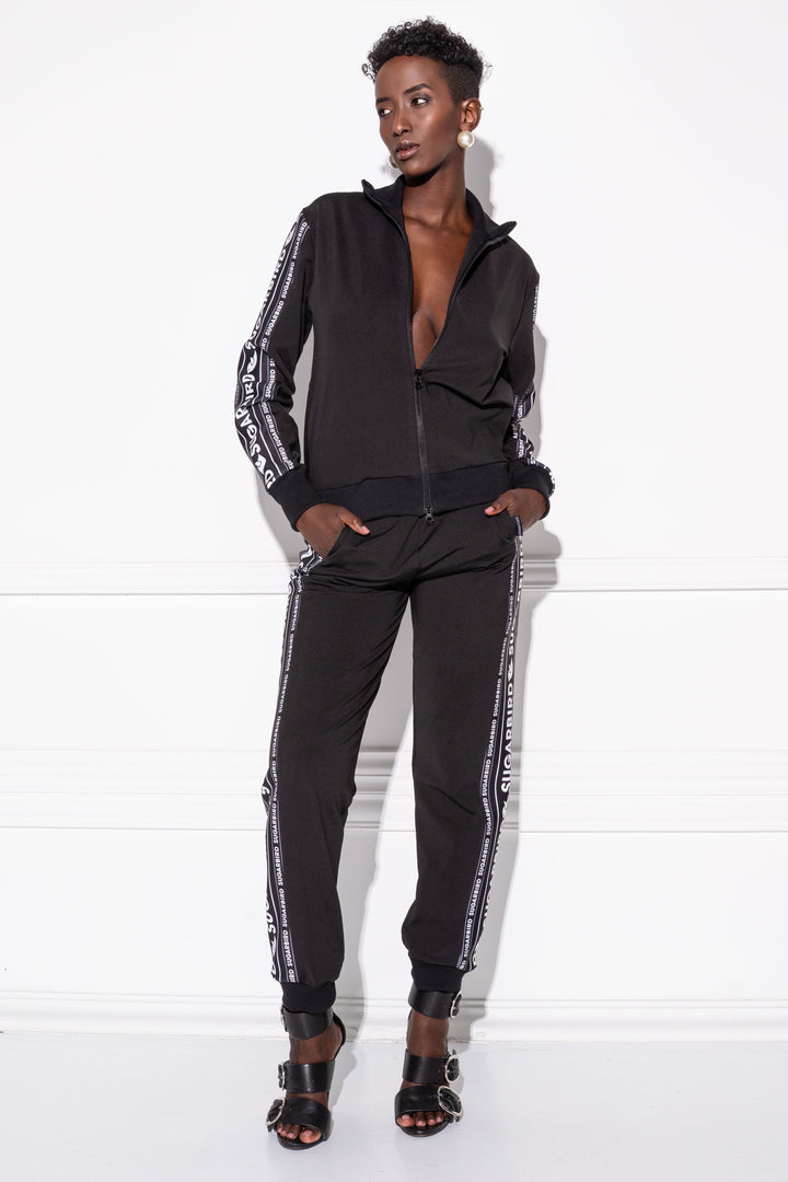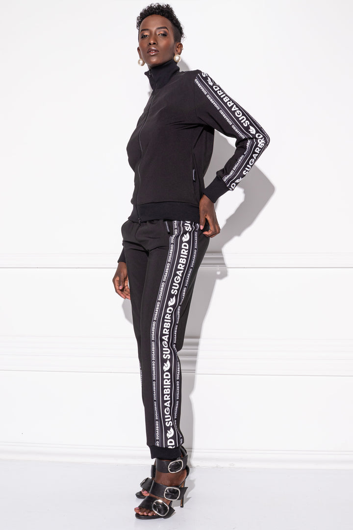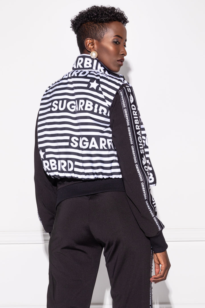 Long-sleeved cardigan, reaching above the hips, with a wide, passé fabric, folded in half strap at the neck, bottom and bottom of the sleeves. It opens at the front with a wide black zipper, and there are pockets on the sides. On the sleeves SUGARBIRD We sewed a label with the inscription.