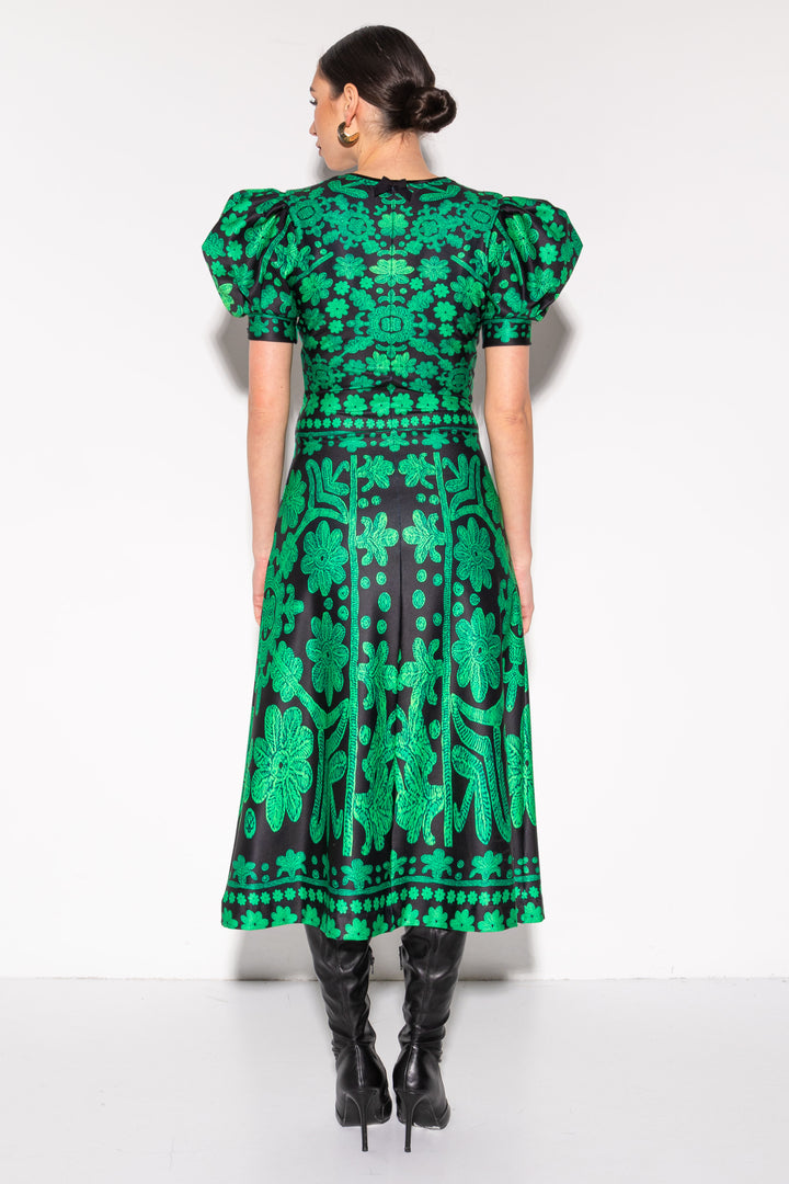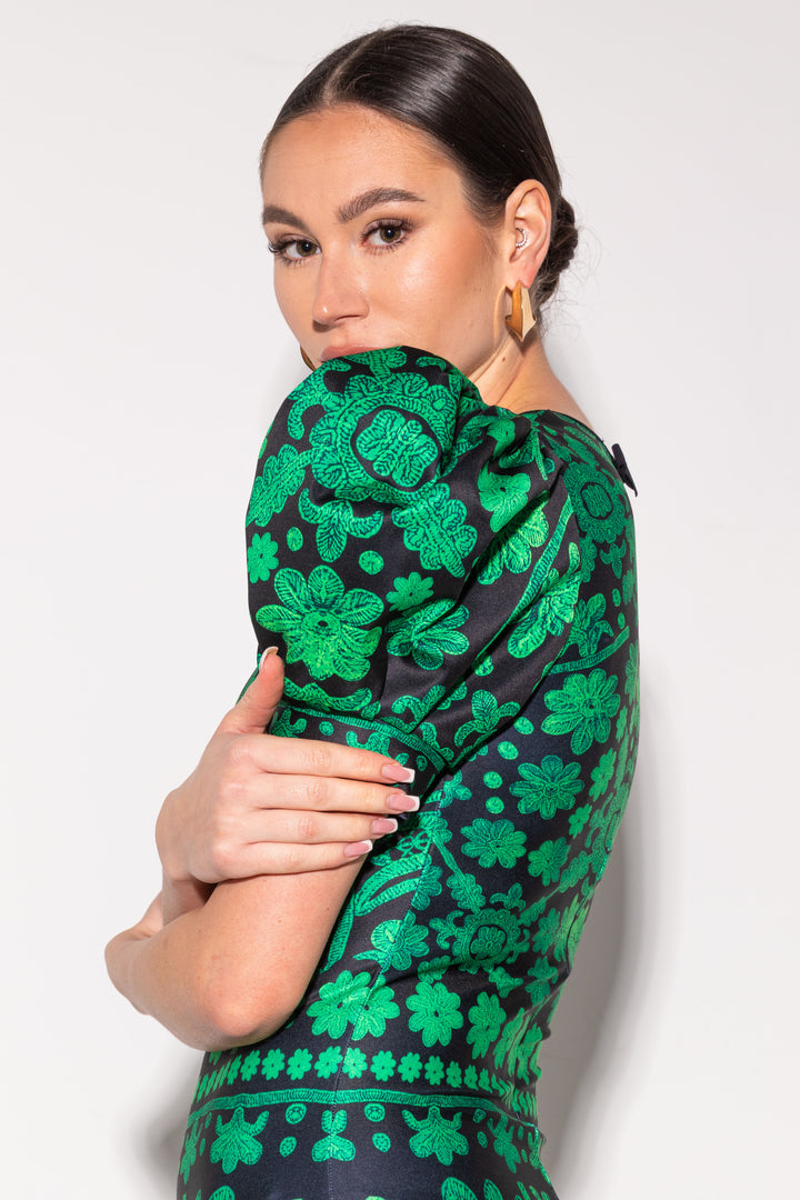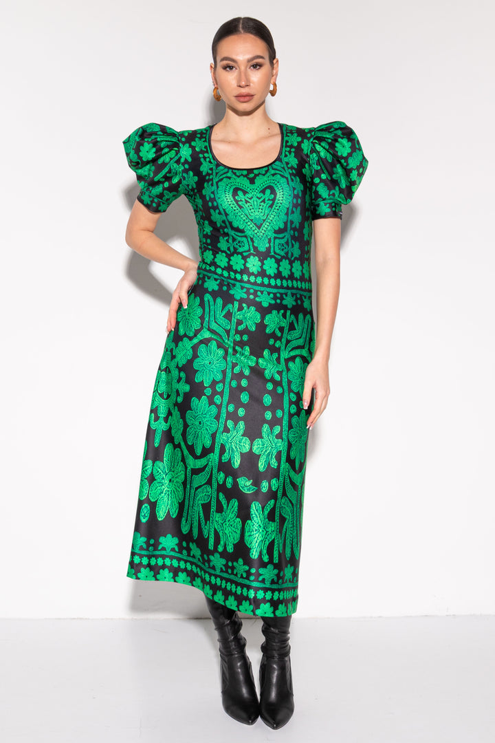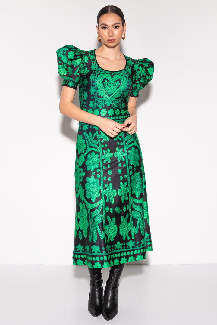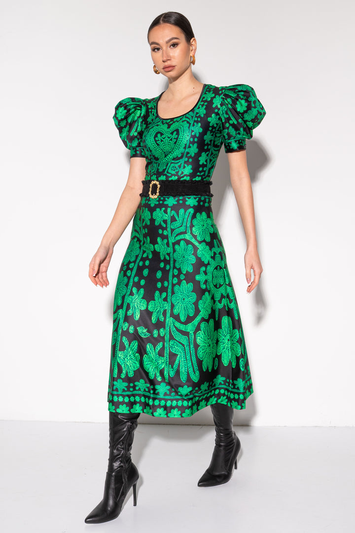The pattern of our collection is decorated with graphics printed in green on a black background, based on the Kalotaszeg written embroidery found in Transylvania.