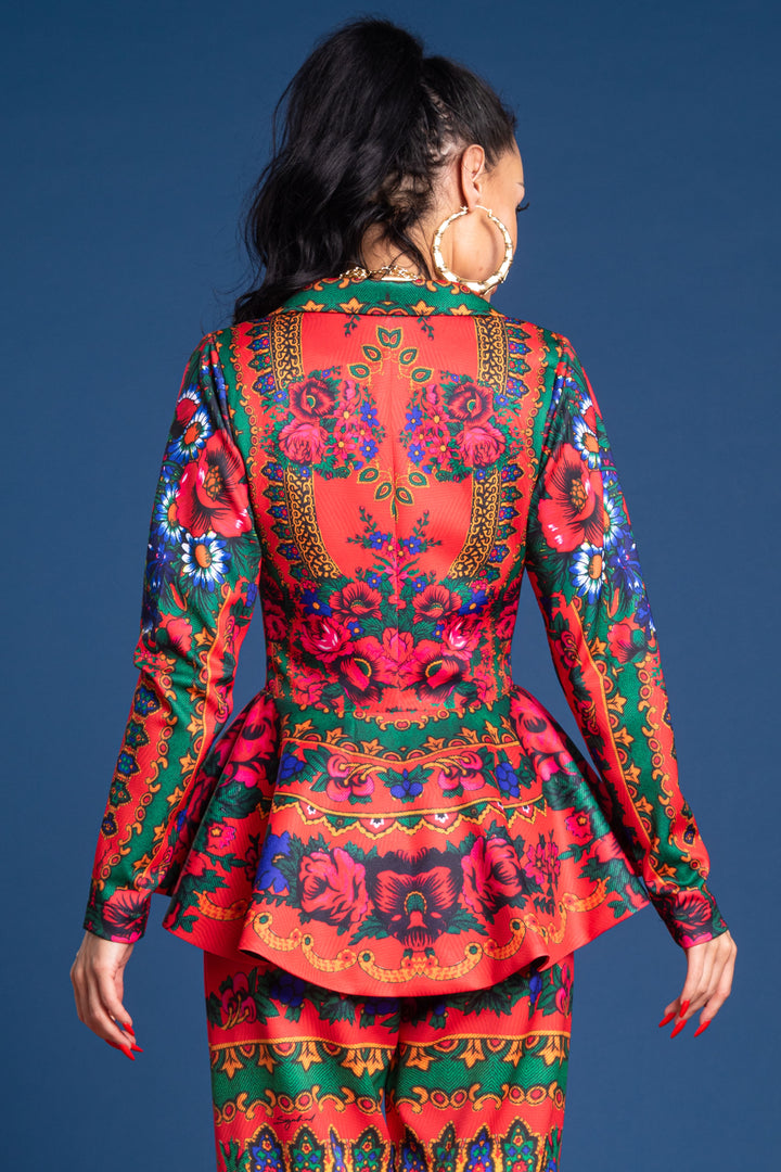 A waist-length, long-sleeved, lined, slim-fit blazer. The neck is cut in a V shape and has a turn-up collar. The front closes with hook-and-eye fasteners in the middle. The bottom is edged with a wide ruffle from the waist. On the sleeves