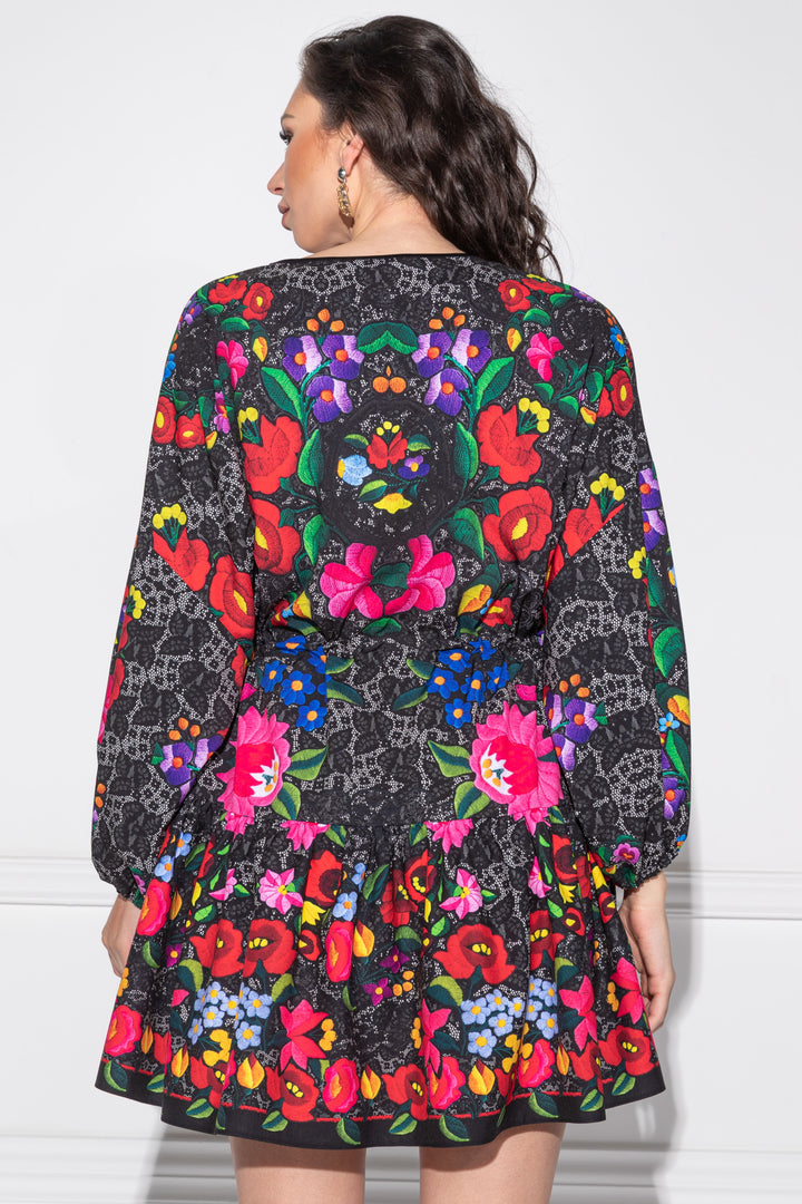 Long-sleeved, extra loose-fitting, mid-thigh-length dress. The closed, round neckline is edged with a narrow, black strap, and the bottom is edged with a wide ruffle. The waist can be narrowed to the waist thanks to a tie. The bottom of the sleeves is elasticated, the bottom of the left front is with woven ribbon