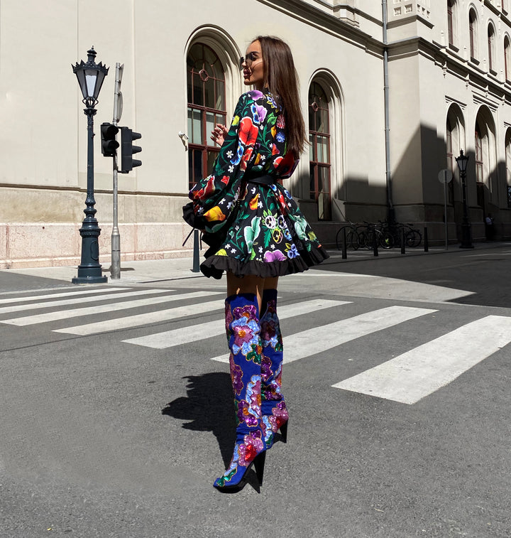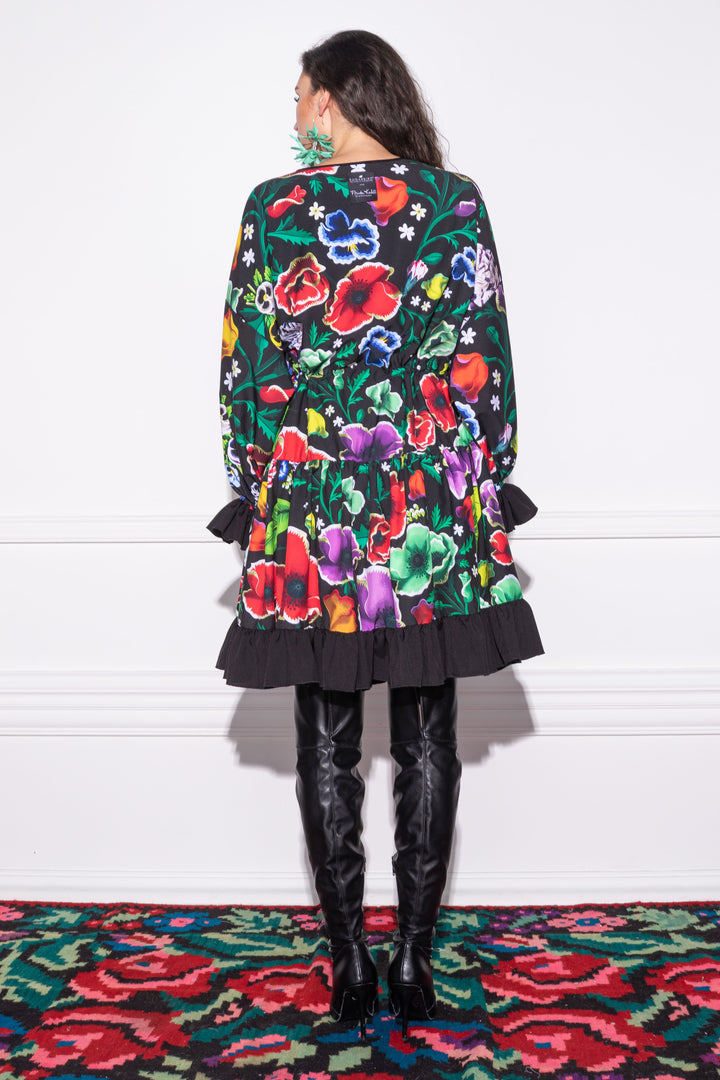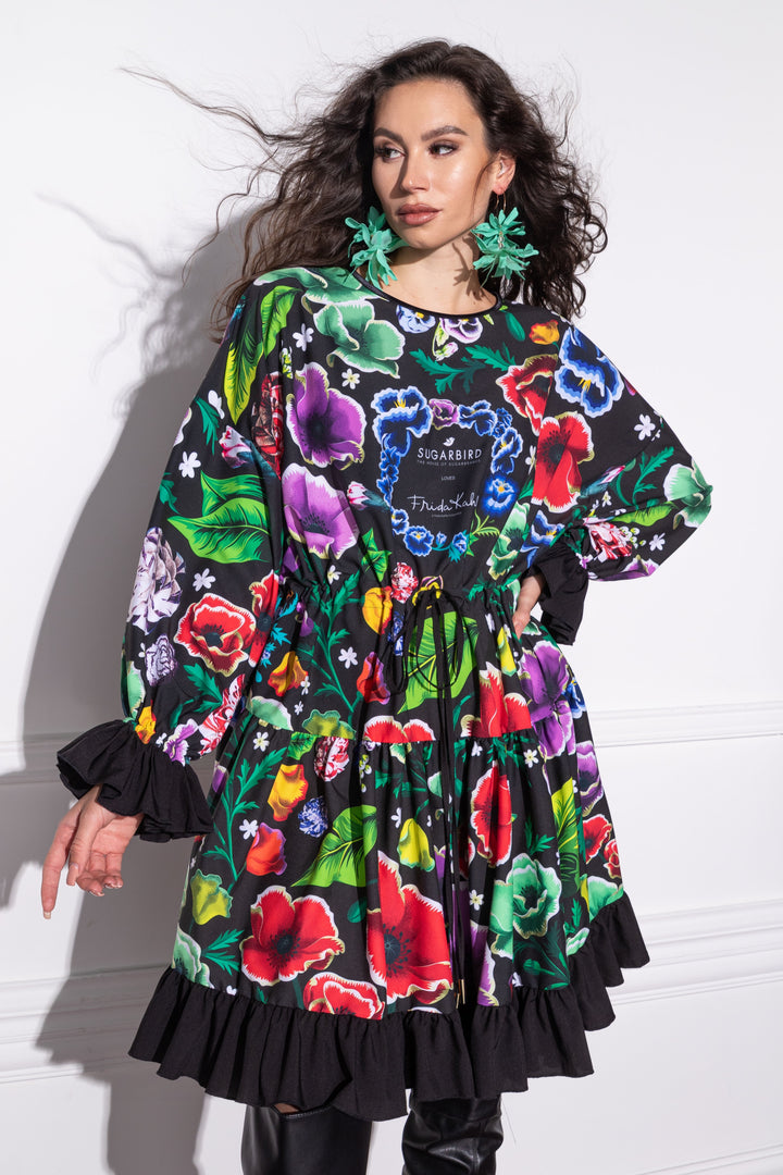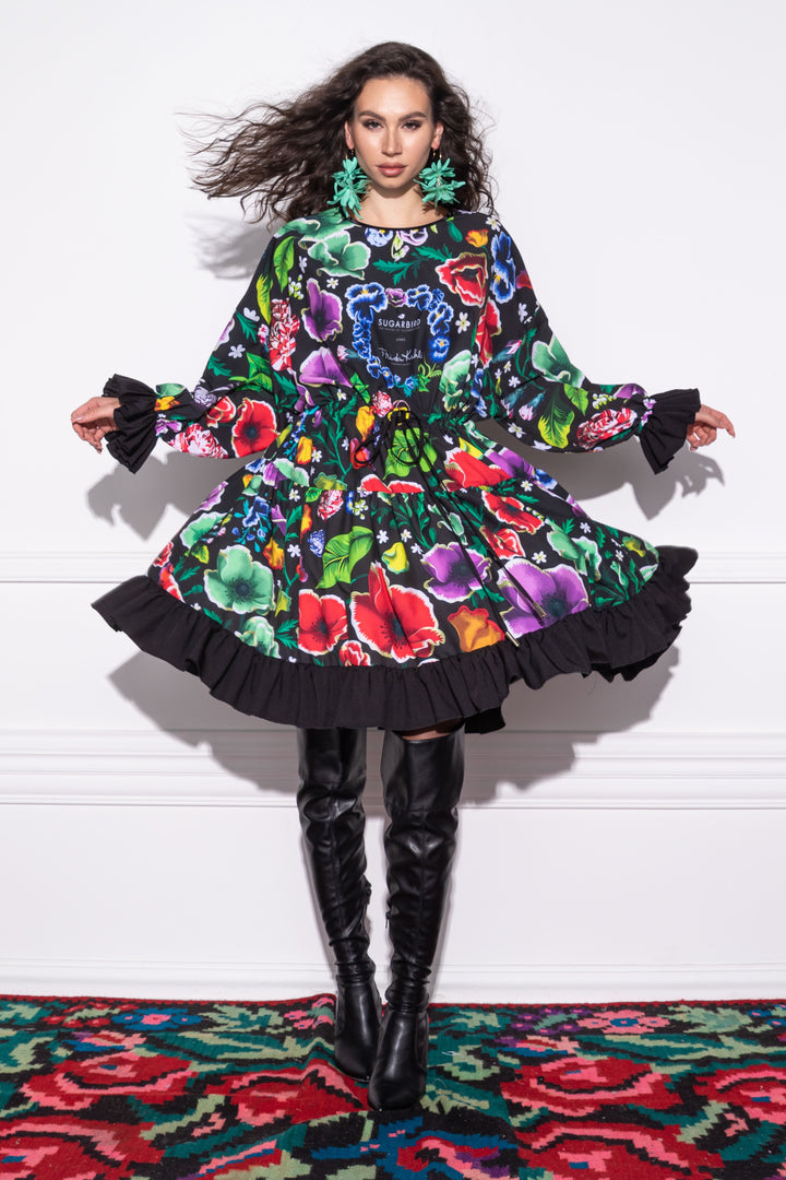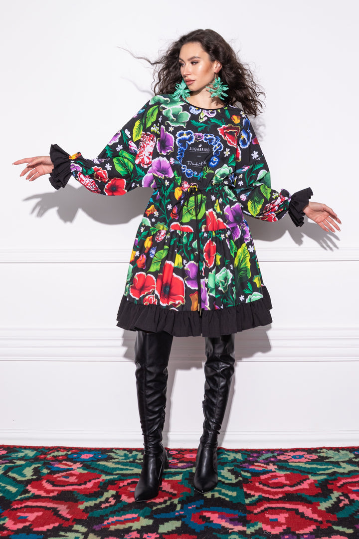 Long-sleeved, extra-loose dress with ruffles at the bottom and sleeves, reaching above the knee. Closed, round neck with narrow strap. The waist can be narrowed with a narrow drawstring. On the back