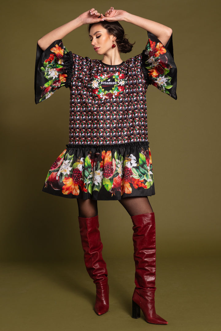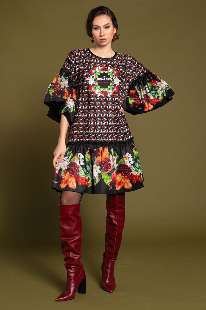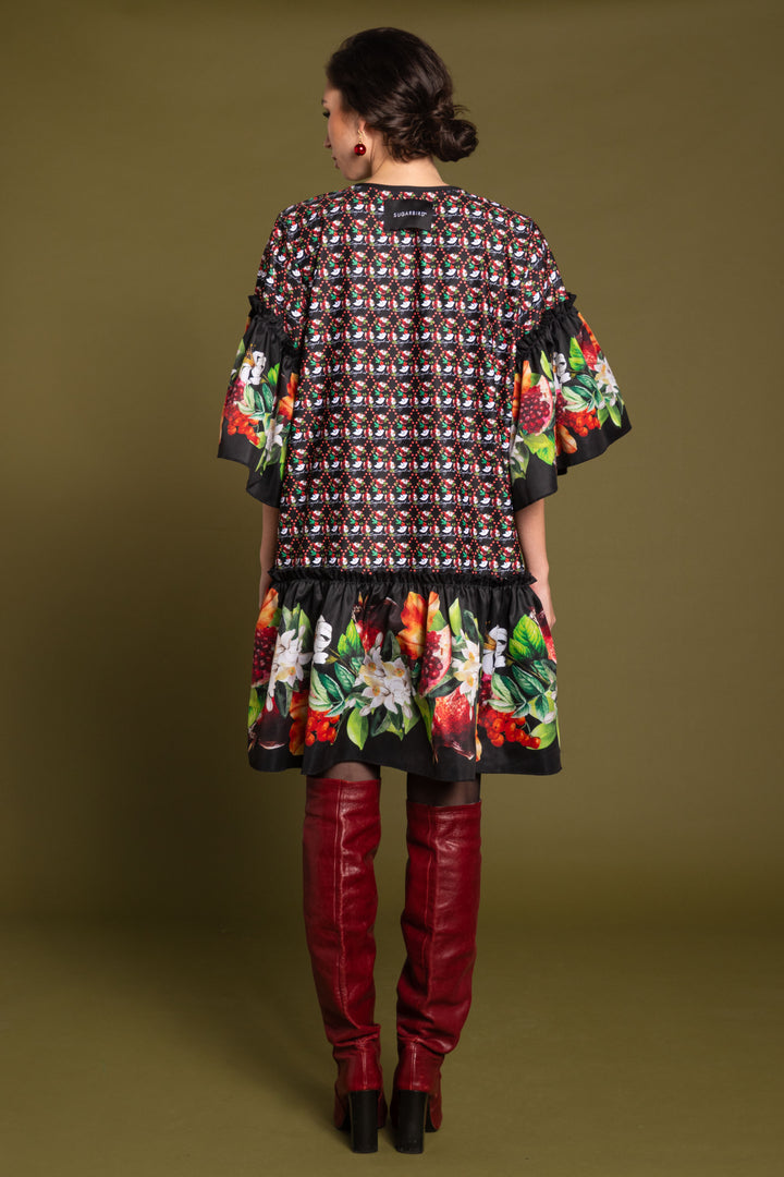Above-knee length, short-sleeved, loose-fitting dress. Closed and round neckline with a folded strap. Shoulders and bottom are decorated with wide and drawn ruffles. Back