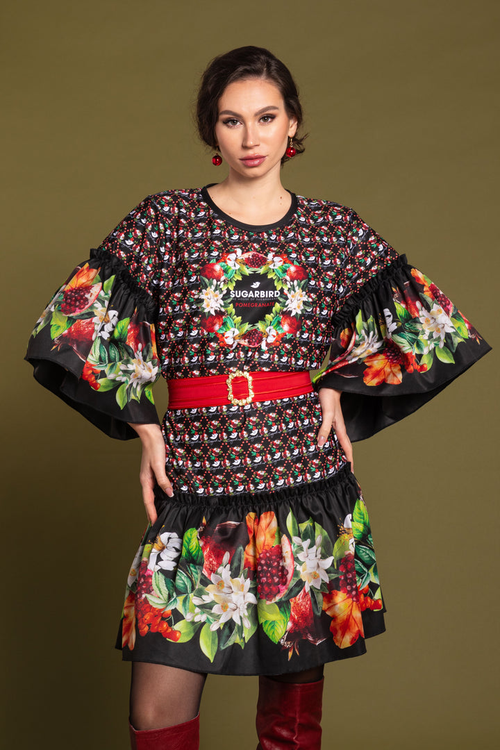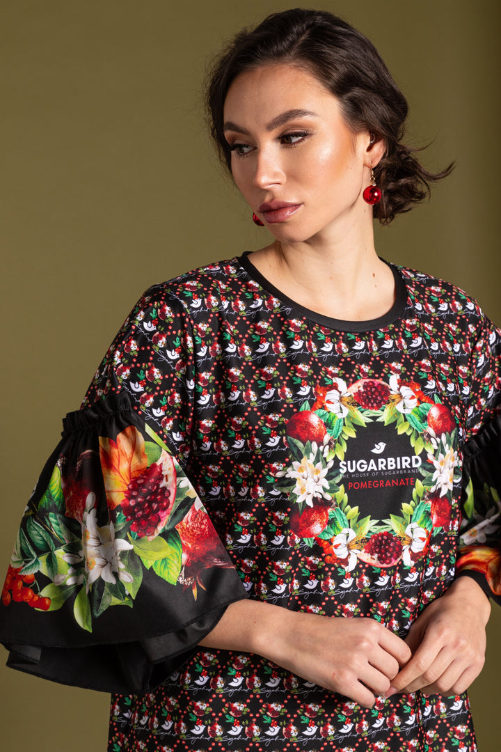 Choose from our favorite styles, now made special by pomegranate, flower and leaf motifs printed on a black background.