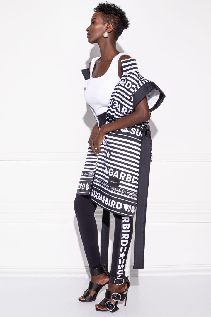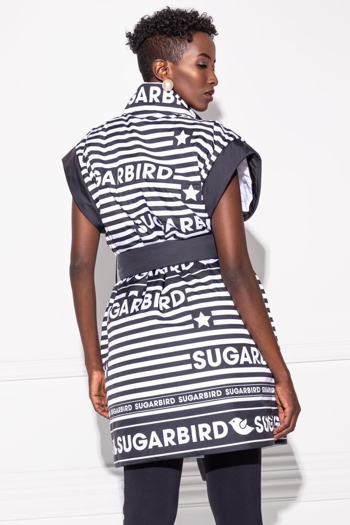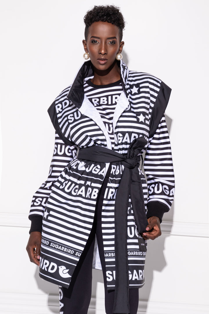 A straight-cut, lined puffy vest with a stand-up collar and mid-thigh length. There are pockets on the sides. The vest is complemented by a long and wide belt that can be tied at the waist. Back to top