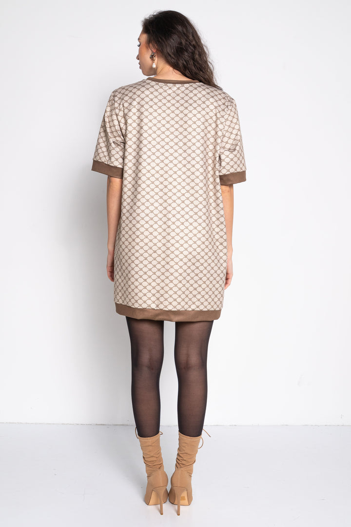 Short sleeves, loose, loose fit, mid-thigh length tunic. Its closed round neck is edged with a narrow strap. It is equipped with a woven ribbon at the front. SUGARBIRD We sewed a label with the inscription.
