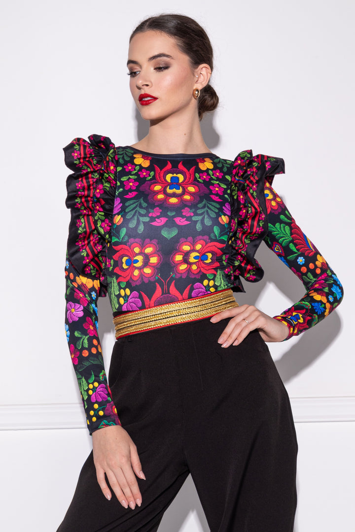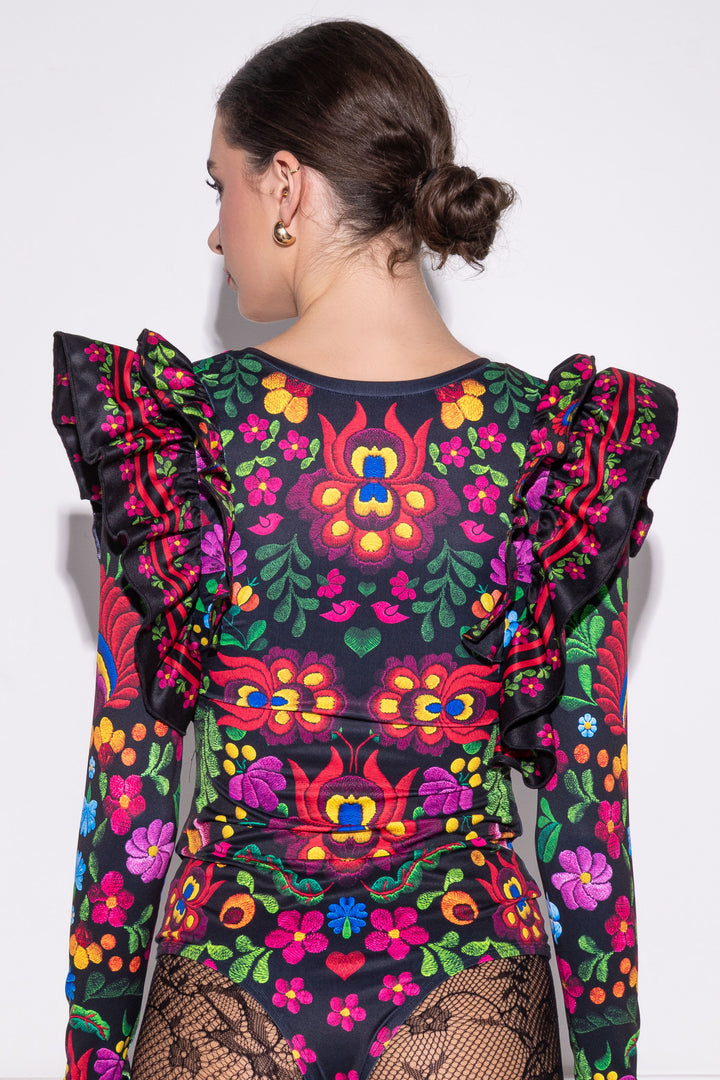 Elől zárt, hátán mély és íves nyakkivágású, alak követő, hosszú ujjú body, melynek nyakkörét félbehajtott pánt szegi. Vállait két-két széles, húzott fodor díszíti. Alul gumizott combrésszel, ülepén állítható kapoccsal záródik. A fazonra kicsi, SUGARBIRD feliratú címkét varrtunk.